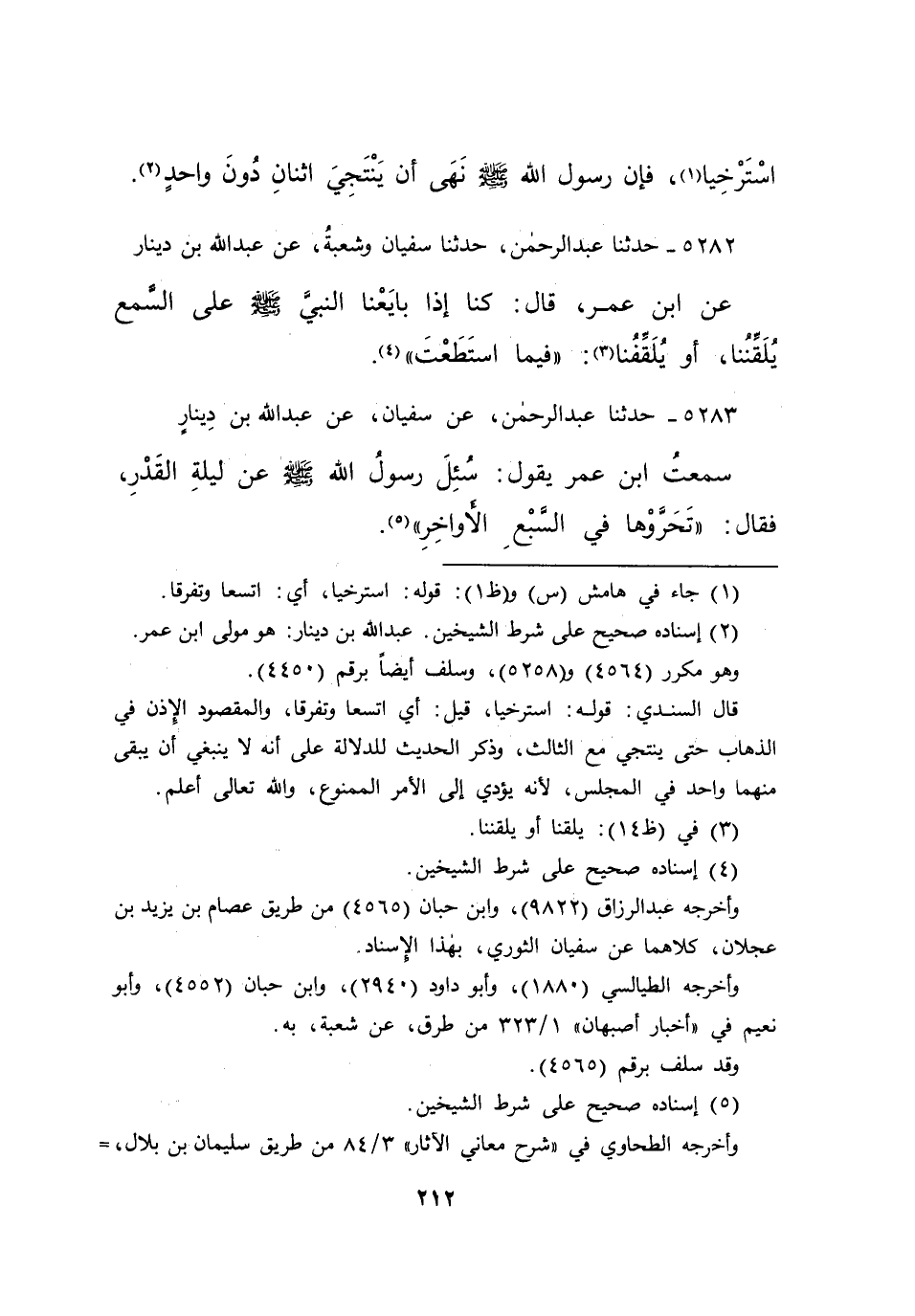 ٥٢٨٢ - حَدَّثَنَا عَبْدُ الرَّحْمَنِ، حَدَّثَنَا سُفْيَانُ، وَشُعْبَةُ، عَنْ عَبْدِ اللهِ بْنِ دِينَارٍ، عَنِ ابْنِ عُمَرَ قَالَ: كُنَّا إِذَا بَايَعْنَا النَّبِيَّ صَلَّى اللهُ عَلَيْهِ وَسَلَّمَ عَلَى السَّمْعِ يُلَقِّنُنَا أَوْ يُلَقِّفُنَا (٣) " فِيمَا اسْتَطَعْتَ " (٤)