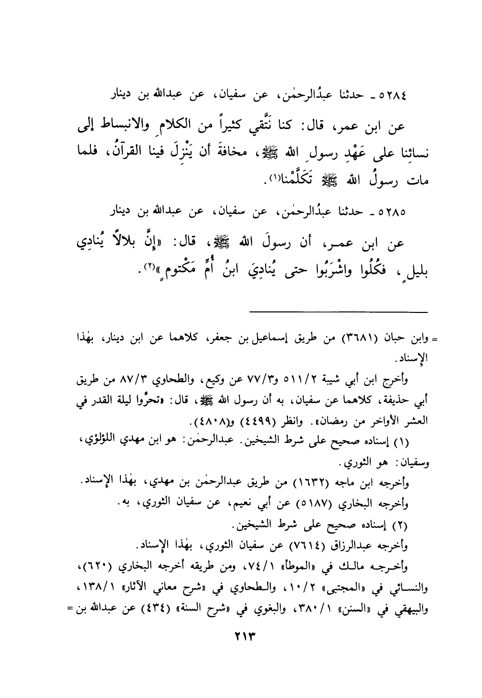 ٥٢٨٥ - حَدَّثَنَا عَبْدُ الرَّحْمَنِ، عَنْ سُفْيَانَ، عَنْ عَبْدِ اللهِ بْنِ دِينَارٍ، عَنِ ابْنِ عُمَرَ، أَنَّ رَسُولَ اللهِ صَلَّى اللهُ عَلَيْهِ وَسَلَّمَ قَالَ: " إِنَّ بِلَالًا يُنَادِي بِلَيْلٍ، فَكُلُوا وَاشْرَبُوا حَتَّى يُنَادِيَ ابْنُ أُمِّ مَكْتُومٍ " (٢)