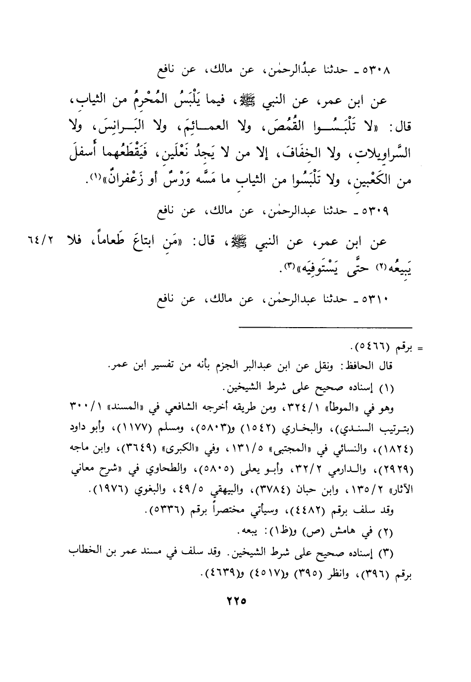 ٥٣٠٨ - حَدَّثَنَا عَبْدُ الرَّحْمَنِ، عَنْ مَالِكٍ، عَنْ نَافِعٍ، عَنِ ابْنِ عُمَرَ، عَنِ النَّبِيِّ صَلَّى اللهُ عَلَيْهِ وَسَلَّمَ فِيمَا يَلْبَسُ الْمُحْرِمُ مِنَ الثِّيَابِ قَالَ: " لَا تَلْبَسُوا الْقُمُصَ، وَلَا الْعَمَائِمَ، وَلَا الْبَرَانِسَ، وَلَا السَّرَاوِيلَاتِ، وَلَا الْخِفَافَ، إِلَّا مَنْ لَا يَجِدُ نَعْلَيْنِ فَيَقْطَعُهُمَا أَسْفَلَ مِنَ الْكَعْبَيْنِ، وَلَا تَلْبَسُوا مِنَ الثِّيَابِ مَا مَسَّهُ وَرْسٌ أَوْ زَعْفَرَانٌ " (١)