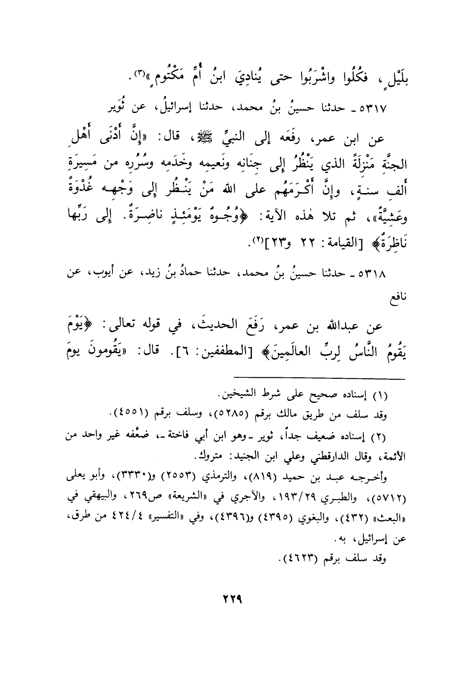 ٥٣١٧ - حَدَّثَنَا حُسَيْنُ بْنُ مُحَمَّدٍ، حَدَّثَنَا إِسْرَائِيلُ، عَنْ ثُوَيْرٍ، عَنِ ابْنِ عُمَرَ، رَفَعَهُ إِلَى النَّبِيِّ صَلَّى اللهُ عَلَيْهِ وَسَلَّمَ قَالَ: " إِنَّ أَدْنَى أَهْلِ الْجَنَّةِ مَنْزِلَةً الَّذِي يَنْظُرُ إِلَى جِنَانِهِ وَنَعِيمِهِ وَخَدَمِهِ وَسُرُرِهِ مِنْ مَسِيرَةِ أَلْفِ سَنَةٍ، وَإِنَّ أَكْرَمَهُمْ عَلَى اللهِ، مَنْ يَنْظُرُ إِلَى وَجْهِهِ غُدْوَةً وَعَشِيَّةً، ثُمَّ تَلَا هَذِهِ الْآيَةَ ": {وُجُوهٌ يَوْمَئِذٍ نَاضِرَةٌ إِلَى رَبِّهَا نَاظِرَةٌ} [القيامة: ٢٣] (٢)