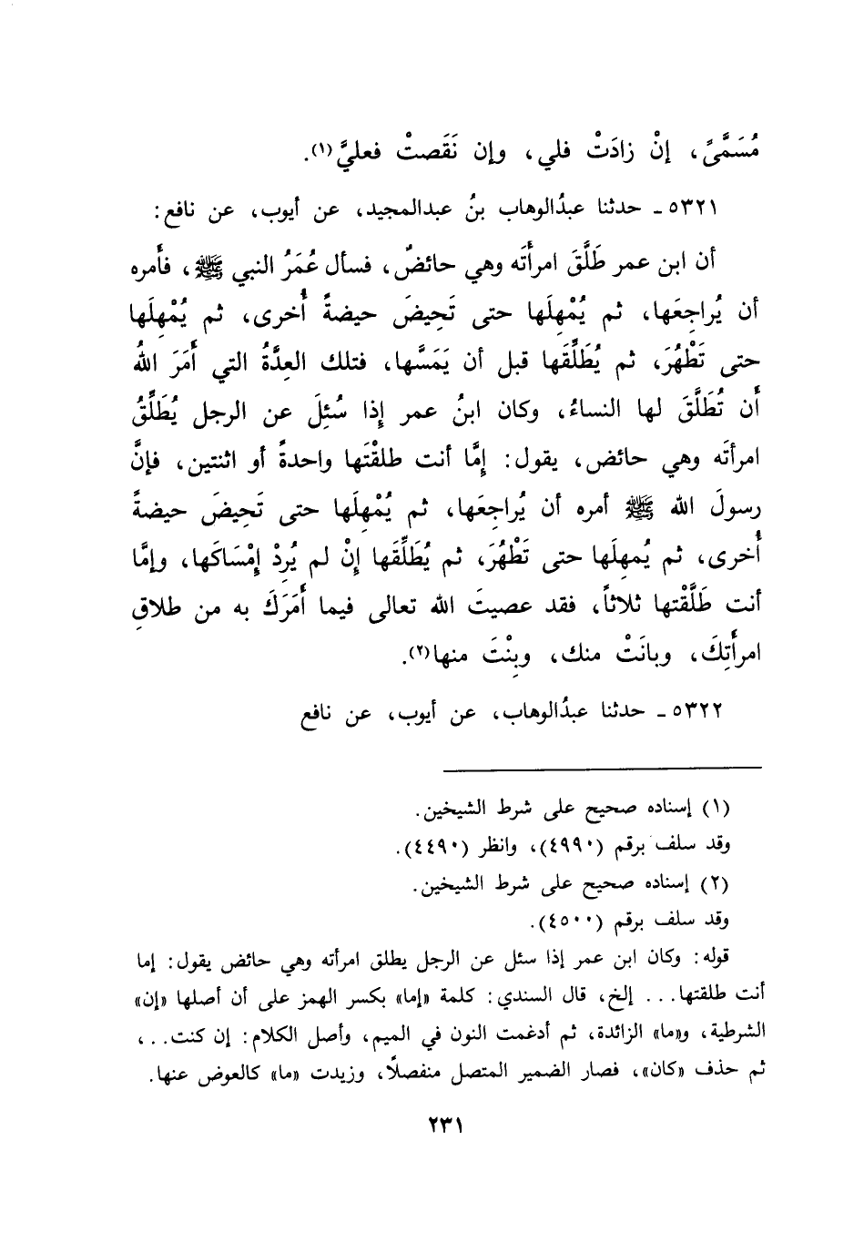 ٥٣٢١ - حَدَّثَنَا عَبْدُ الْوَهَّابِ بْنُ عَبْدِ الْمَجِيدِ، عَنْ أَيُّوبَ، عَنْ نَافِعٍ، أَنَّ ابْنَ عُمَرَ، طَلَّقَ امْرَأَتَهُ وَهِيَ حَائِضٌ، فَسَأَلَ عُمَرُ النَّبِيَّ صَلَّى اللهُ عَلَيْهِ وَسَلَّمَ " فَأَمَرَهُ أَنْ يُرَاجِعَهَا، ثُمَّ يُمْهِلَهَا حَتَّى تَحِيضَ حَيْضَةً أُخْرَى، ثُمَّ يُمْهِلَهَا حَتَّى تَطْهُرَ، ثُمَّ يُطَلِّقَهَا قَبْلَ أَنْ يَمَسَّهَا " فَتِلْكَ الْعِدَّةُ الَّتِي أَمَرَ اللهُ أَنْ تُطَلَّقَ لَهَا النِّسَاءُ، وَكَانَ ابْنُ عُمَرَ إِذَا سُئِلَ عَنِ الرَّجُلِ يُطَلِّقُ امْرَأَتَهُ وَهِيَ حَائِضٌ؟ يَقُولُ: إِمَّا أَنْتَ طَلَّقْتَهَا وَاحِدَةً أَوِ اثْنَتَيْنِ، فَإِنَّ رَسُولَ اللهِ صَلَّى اللهُ عَلَيْهِ وَسَلَّمَ " أَمَرَهُ أَنْ يُرَاجِعَهَا، ثُمَّ يُمْهِلَهَا حَتَّى تَحِيضَ حَيْضَةً أُخْرَى، ثُمَّ يُمْهِلَهَا حَتَّى تَطْهُرَ، ثُمَّ يُطَلِّقَهَا إِنْ لَمْ يُرِدْ إِمْسَاكَهَا " وَإِمَّا أَنْتَ طَلَّقْتَهَا ثَلَاثًا فَقَدْ عَصَيْتَ اللهَ تَعَالَى فِيمَا أَمَرَكَ بِهِ مِنْ طَلَاقِ امْرَأَتِكَ وَبَانَتْ مِنْكَ وَبِنْتَ مِنْهَا (٢)
