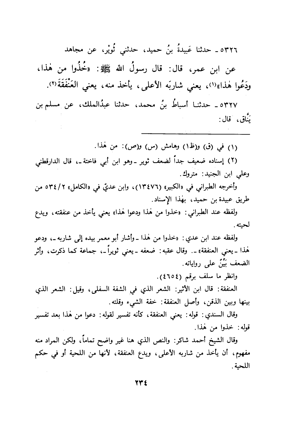 ٥٣٢٦ - حَدَّثَنَا عَبِيدَةُ بْنُ حُمَيْدٍ، حَدَّثَنِي ثُوَيْرٌ، عَنْ مُجَاهِدٍ، عَنِ ابْنِ عُمَرَ قَالَ: قَالَ رَسُولُ اللهِ صَلَّى اللهُ عَلَيْهِ وَسَلَّمَ: " خُذُوا مِنْ هَذَا وَدَعُوا هَذَا " (١) يَعْنِي: شَارِبَهُ الْأَعْلَى، يَأْخُذُ مِنْهُ، يَعْنِي الْعَنْفَقَةَ (٢)