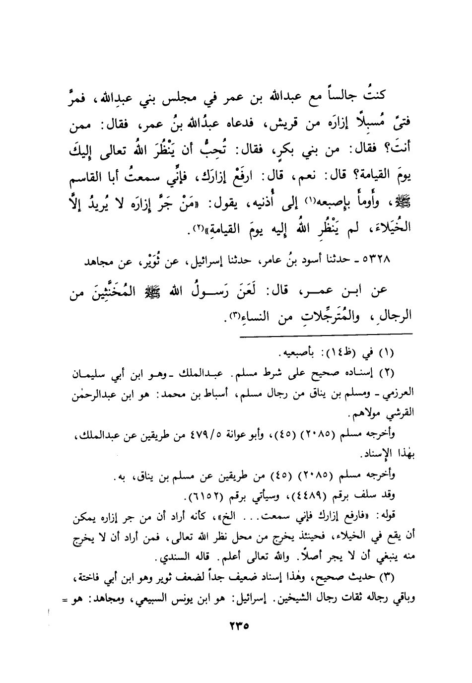 كُنْتُ جَالِسًا مَعَ عَبْدِ اللهِ بْنِ عُمَرَ فِي مَجْلِسِ بَنِي عَبْدِ اللهِ، فَمَرَّ فَتًى مُسْبِلًا إِزَارَهُ مِنْ قُرَيْشٍ، فَدَعَاهُ عَبْدُ اللهِ بْنُ عُمَرَ فَقَالَ: مِمَّنْ أَنْتَ؟ فَقَالَ: مِنْ بَنِي بَكْرٍ، فَقَالَ: تُحِبُّ أَنْ يَنْظُرَ اللهُ تَعَالَى إِلَيْكَ يَوْمَ الْقِيَامَةِ؟ قَالَ: نَعَمْ. قَالَ: ارْفَعْ إِزَارَكَ، فَإِنِّي سَمِعْتُ أَبَا الْقَاسِمِ صَلَّى اللهُ عَلَيْهِ وَسَلَّمَ - وَأَوْمَأَ بِإِصْبَعِهِ (١) إِلَى أُذُنَيْهِ - يَقُولُ: " مَنْ جَرَّ إِزَارَهُ لَا يُرِيدُ إِلَّا الْخُيَلَاءَ، لَمْ يَنْظُرِ اللهُ إِلَيْهِ يَوْمَ الْقِيَامَةِ " (٢)