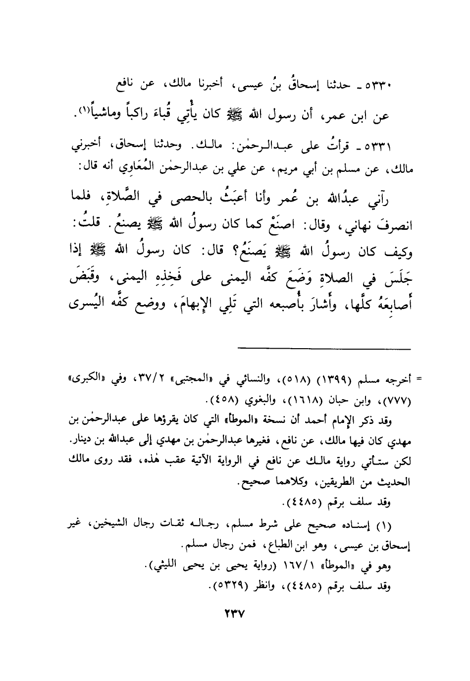 ٥٣٣١ - قَرَأْتُ عَلَى عَبْدِ الرَّحْمَنِ: مَالِكٌ، وحَدَّثَنَا إِسْحَاقُ، أَخْبَرَنِي مَالِكٌ، عَنْ مُسْلِمِ بْنِ أَبِي مَرْيَمَ، عَنْ عَلِيِّ بْنِ عَبْدِ الرَّحْمَنِ الْمُعَاوِيِّ، أَنَّهُ قَالَ: رَآنِي عَبْدُ اللهِ بْنُ عُمَرَ وَأَنَا أَعْبَثُ بِالْحَصَى فِي الصَّلَاةِ، فَلَمَّا انْصَرَفَ نَهَانِي وَقَالَ: اصْنَعْ كَمَا كَانَ رَسُولُ اللهِ صَلَّى اللهُ عَلَيْهِ وَسَلَّمَ يَصْنَعُ، قُلْتُ: وَكَيْفَ كَانَ رَسُولُ اللهِ صَلَّى اللهُ عَلَيْهِ وَسَلَّمَ يَصْنَعُ؟ قَالَ: " كَانَ رَسُولُ اللهِ صَلَّى اللهُ عَلَيْهِ وَسَلَّمَ إِذَا جَلَسَ فِي الصَّلَاةِ وَضَعَ كَفَّهُ الْيُمْنَى عَلَى فَخِذِهِ الْيُمْنَى، وَقَبَضَ أَصَابِعَهُ كُلَّهَا، وَأَشَارَ بِإِصْبَعِهِ الَّتِي تَلِي الْإِبْهَامَ، وَوَضَعَ كَفَّهُ الْيُسْرَى