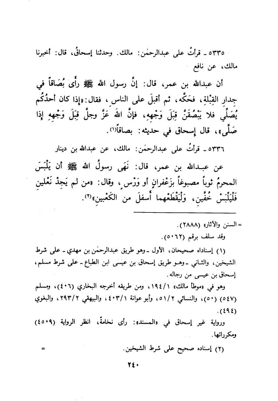 ٥٣٣٥ - قَرَأْتُ عَلَى عَبْدِ الرَّحْمَنِ، مَالِكٌ، وَحَدَّثَنَا إِسْحَاقُ قَالَ: أَخْبَرَنَا مَالِكٌ، عَنْ نَافِعٍ، أَنَّ عَبْدَ اللهِ بْنَ عُمَرَ قَالَ: إِنَّ رَسُولَ اللهِ صَلَّى اللهُ عَلَيْهِ وَسَلَّمَ رَأَى بُصَاقًا فِي جِدَارِ الْقِبْلَةِ فَحَكَّهُ، ثُمَّ أَقْبَلَ عَلَى النَّاسِ، فَقَالَ: " إِذَا كَانَ أَحَدُكُمْ يُصَلِّي فَلَا يَبْصُقَنَّ قِبَلَ وَجْهِهِ، فَإِنَّ اللهَ عَزَّ وَجَلَّ قِبَلَ وَجْهِهِ إِذَا صَلَّى " قَالَ إِسْحَاقُ فِي حَدِيثِهِ: بُصَاقًا (١)