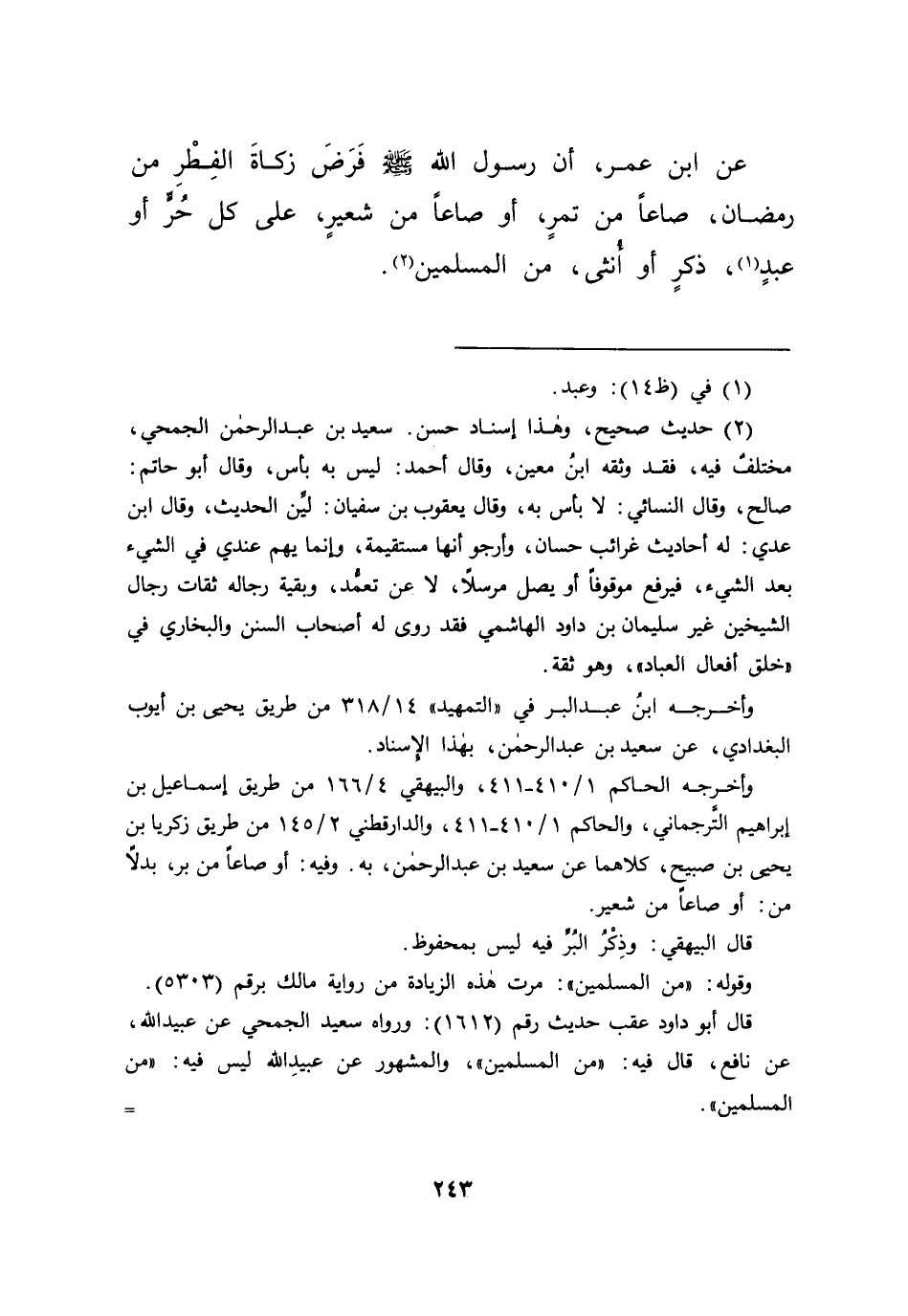 قال أبو داود عقب حديث رقم (١٦١٢) : ورواه سعيد الجمحي عن عبيد الله، عن نافع، قال فيه:"من المسلمين"، والمشهور عن عبيد الله ليس فيه:"من المسلمين".=
