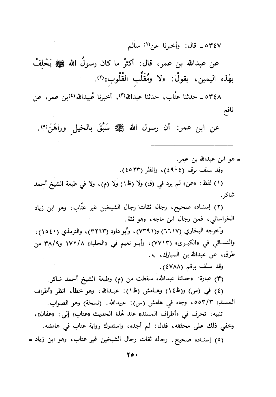 ٥٣٤٧ - قَالَ: وَأَخْبَرَنَا عَنْ (١) سَالِمٍ، عَنْ عَبْدِ اللهِ بْنِ عُمَرَ قَالَ: أَكْثَرُ مَا كَانَ رَسُولُ اللهِ صَلَّى اللهُ عَلَيْهِ وَسَلَّمَ يَحْلِفُ بِهَذِهِ الْيَمِينِ يَقُولُ: " لَا وَمُقَلِّبِ الْقُلُوبِ " (٢)