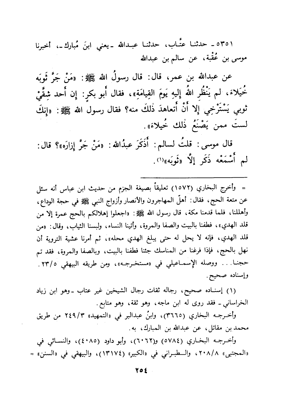 ٥٣٥١ - حَدَّثَنَا عَتَّابٌ، حَدَّثَنَا عَبْدُ اللهِ يَعْنِي ابْنَ مُبَارَكٍ، أَخْبَرَنَا مُوسَى بْنُ عُقْبَةَ، عَنْ سَالِمِ بْنِ عَبْدِ اللهِ، عَنْ عَبْدِ اللهِ بْنِ عُمَرَ قَالَ: قَالَ رَسُولُ اللهِ صَلَّى اللهُ عَلَيْهِ وَسَلَّمَ: " مَنْ جَرَّ ثَوْبَهُ خُيَلَاءَ لَمْ يَنْظُرِ اللهُ إِلَيْهِ يَوْمَ الْقِيَامَةِ ". فَقَالَ أَبُو بَكْرٍ: إِنَّ أَحَدَ شِقَّيْ ثَوْبِي يَسْتَرْخِي، إِلَّا أَنْ أَتَعَاهَدَ ذَلِكَ مِنْهُ؟ فَقَالَ رَسُولُ اللهِ صَلَّى اللهُ عَلَيْهِ وَسَلَّمَ: " إِنَّكَ لَسْتَ مِمَّنْ يَصْنَعُ ذَلِكَ خُيَلَاءَ " قَالَ مُوسَى: قُلْتُ: لِسَالِمٍ أَذَكَرَ عَبْدُ اللهِ، مَنْ جَرَّ إِزَارَهُ؟ قَالَ: " لَمْ أَسْمَعْهُ ذَكَرَ إِلَّا ثَوْبَهُ " (١)