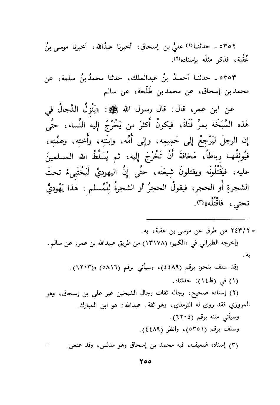 ٥٣٥٣ - حَدَّثَنَا أَحْمَدُ بْنُ عَبْدِ الْمَلِكِ، حَدَّثَنَا مُحَمَّدُ بْنُ سَلَمَةَ، عَنْ مُحَمَّدِ بْنِ إِسْحَاقَ، عَنْ مُحَمَّدِ بْنِ طَلْحَةَ، عَنْ سَالِمٍ، عَنِ ابْنِ عُمَرَ قَالَ: قَالَ رَسُولُ اللهِ صَلَّى اللهُ عَلَيْهِ وَسَلَّمَ: " يَنْزِلُ الدَّجَّالُ فِي هَذِهِ السَّبَخَةِ بِمَرِّقَنَاةَ، فَيَكُونُ أَكْثَرَ مَنْ يَخْرُجُ إِلَيْهِ النِّسَاءُ، حَتَّى إِنَّ الرَّجُلَ لَيَرْجِعُ إِلَى حَمِيمِهِ وَإِلَى أُمِّهِ وَابْنَتِهِ وَأُخْتِهِ وَعَمَّتِهِ، فَيُوثِقُهَا رِبَاطًا، مَخَافَةَ أَنْ تَخْرُجَ إِلَيْهِ، ثُمَّ يُسَلِّطُ اللهُ الْمُسْلِمِينَ عَلَيْهِ، فَيَقْتُلُونَهُ وَيَقْتُلُونَ شِيعَتَهُ، حَتَّى إِنَّ الْيَهُودِيَّ، لَيَخْتَبِئُ تَحْتَ الشَّجَرَةِ أَوِ الْحَجَرِ فَيَقُولُ الْحَجَرُ أَوِ الشَّجَرَةُ لِلْمُسْلِمِ: هَذَا يَهُودِيٌّ تَحْتِي فَاقْتُلْهُ " (٣)
