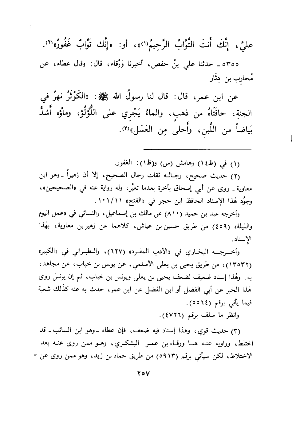 ٥٣٥٥ - حَدَّثَنَا عَلِيُّ بْنُ حَفْصٍ، أَخْبَرَنَا وَرْقَاءُ قَالَ: وَقَالَ عَطَاءٌ، عَنْ مُحَارِبِ بْنِ دِثَارٍ، عَنِ ابْنِ عُمَرَ قَالَ: قَالَ لَنَا رَسُولُ اللهِ صَلَّى اللهُ عَلَيْهِ وَسَلَّمَ: " الْكَوْثَرُ نَهَرٌ فِي الْجَنَّةِ، حَافَّتَاهُ مِنْ ذَهَبٍ، وَالْمَاءُ يَجْرِي عَلَى اللُّؤْلُؤِ، وَمَاؤُهُ أَشَدُّ بَيَاضًا مِنَ اللَّبَنِ، وَأَحْلَى مِنَ الْعَسَلِ " (٣)