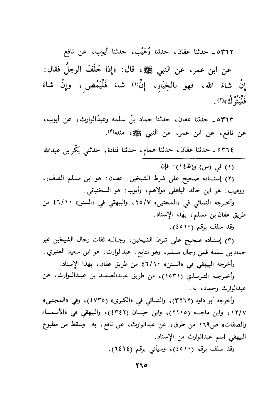 ٥٣٦٣ - حَدَّثَنَا عَفَّانُ، حَدَّثَنَا حَمَّادُ بْنُ سَلَمَةَ، وَعَبْدُ الْوَارِثِ، عَنْ أَيُّوبَ، عَنْ نَافِعٍ، عَنِ ابْنِ عُمَرَ، عَنِ النَّبِيِّ صَلَّى اللهُ عَلَيْهِ وَسَلَّمَ مِثْلَهُ (٣)