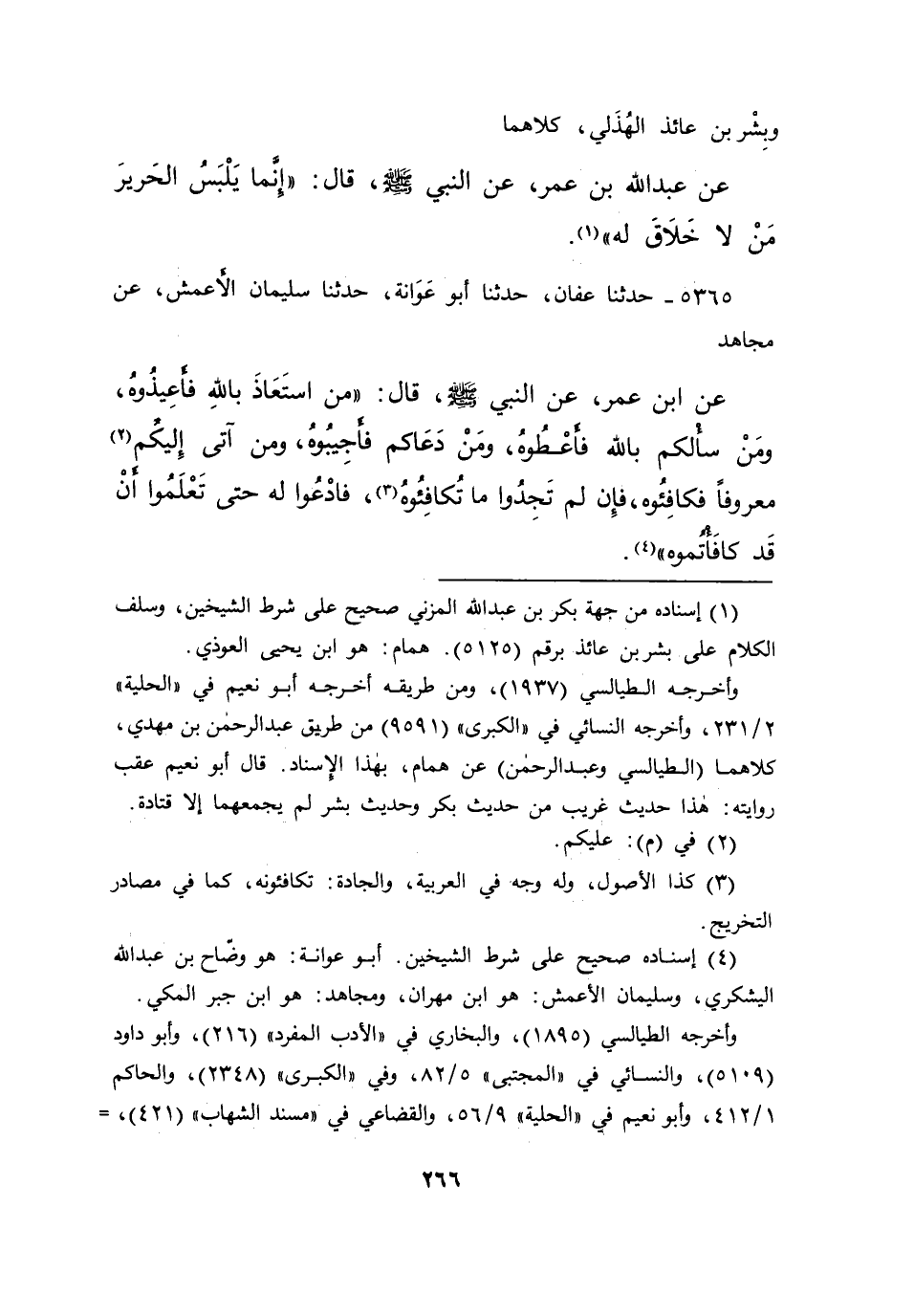 ٥٣٦٥ - حَدَّثَنَا عَفَّانُ، حَدَّثَنَا أَبُو عَوَانَةَ، حَدَّثَنَا سُلَيْمَانُ الْأَعْمَشُ، عَنْ مُجَاهِدٍ، عَنِ ابْنِ عُمَرَ، عَنِ النَّبِيِّ صَلَّى اللهُ عَلَيْهِ وَسَلَّمَ قَالَ: " مَنِ اسْتَعَاذَ بِاللهِ فَأَعِيذُوهُ، وَمَنْ سَأَلَكُمْ بِاللهِ فَأَعْطُوهُ، وَمَنْ دَعَاكُمْ فَأَجِيبُوهُ، وَمَنْ أَتَى إِلَيْكُمْ (٢) مَعْرُوفًا فَكَافِئُوهُ، فَإِنْ لَمْ تَجِدُوا مَا تُكَافِئُوهُ، (٣) فَادْعُوا لَهُ، حَتَّى تَعْلَمُوا أَنْ قَدْ كَافَأْتُمُوهُ " (٤)