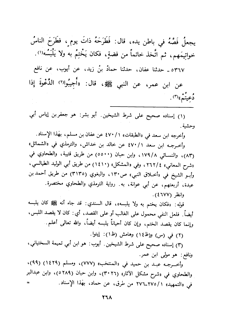 ٥٣٦٧ - حَدَّثَنَا عَفَّانُ، حَدَّثَنَا حَمَّادُ بْنُ زَيْدٍ، عَنْ أَيُّوبَ، عَنْ نَافِعٍ، عَنِ ابْنِ عُمَرَ، عَنِ النَّبِيِّ صَلَّى اللهُ عَلَيْهِ وَسَلَّمَ قَالَ: " أَجِيبُوا (٢) الدَّعْوَةَ إِذَا دُعِيتُمْ " (٣)