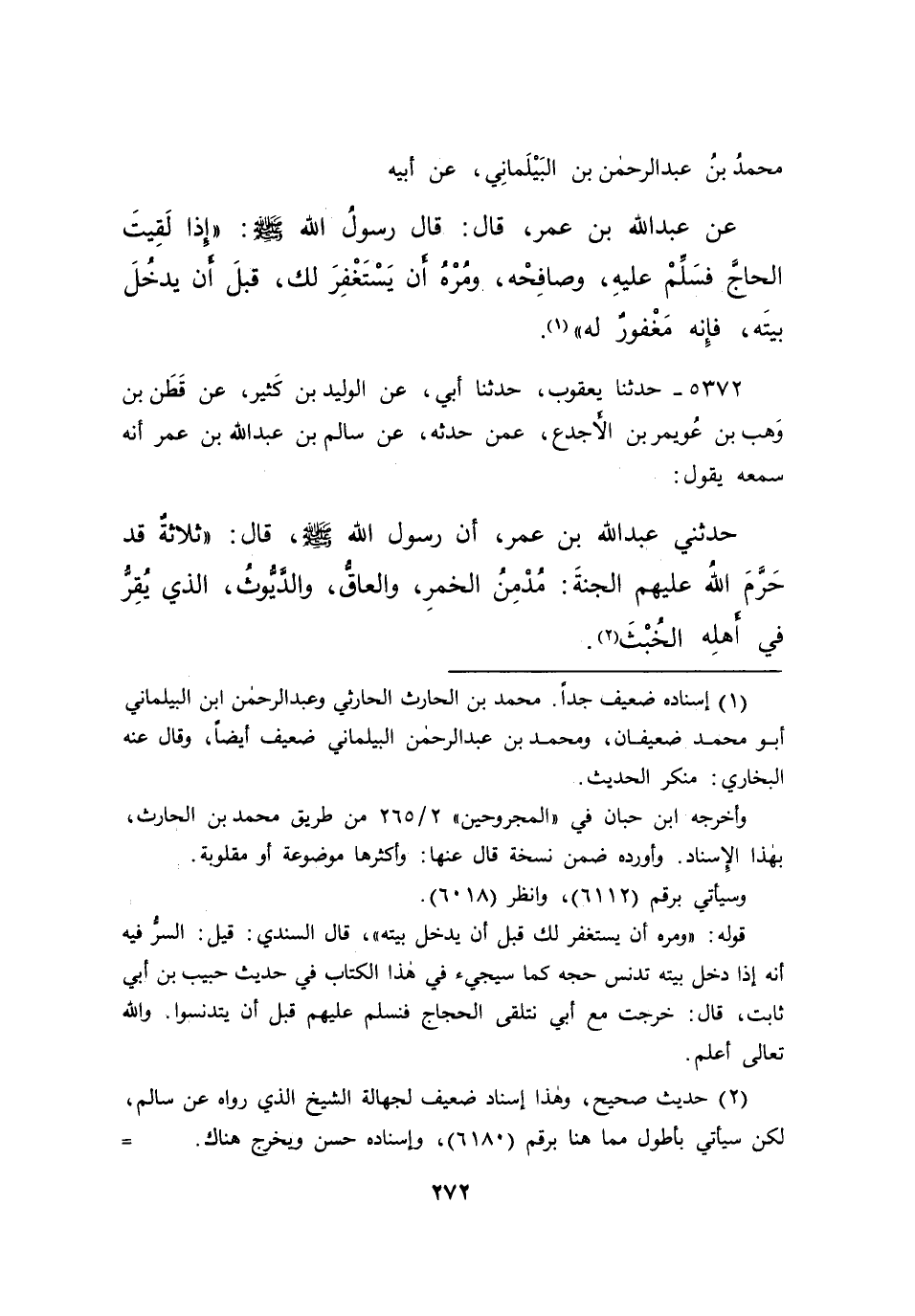 مُحَمَّدُ بْنُ عَبْدِ الرَّحْمَنِ بْنِ الْبَيْلَمَانِيِّ، عَنْ أَبِيهِ، عَنْ عَبْدِ اللهِ بْنِ عُمَرَ قَالَ: قَالَ رَسُولُ اللهِ صَلَّى اللهُ عَلَيْهِ وَسَلَّمَ: " إِذَا لَقِيتَ الْحَاجَّ فَسَلِّمْ عَلَيْهِ وَصَافِحْهُ، وَمُرْهُ أَنْ يَسْتَغْفِرَ لَكَ قَبْلَ أَنْ يَدْخُلَ بَيْتَهُ، فَإِنَّهُ مَغْفُورٌ لَهُ " (١)