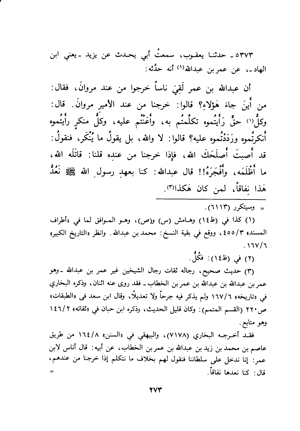 ٥٣٧٣ - حَدَّثَنَا يَعْقُوبُ، سَمِعْتُ أَبِي يُحَدِّثُ، عَنْ يَزِيدَ يَعْنِي ابْنَ الْهَادِ، عَنْ عُمَرَ بْنِ عَبْدِ اللهِ، (١) أَنَّهُ حَدَّثَهُ أَنَّ عَبْدَ اللهِ بْنَ عُمَرَ لَقِيَ نَاسًا خَرَجُوا مِنْ عِنْدِ مَرْوَانَ فَقَالَ: مِنْ أَيْنَ جَاءَ هَؤُلَاءِ؟ قَالُوا: خَرَجْنَا مِنْ عِنْدِ الْأَمِيرِ مَرْوَانَ قَالَ: وَكُلُّ (٢) حَقٍّ رَأَيْتُمُوهُ تَكَلَّمْتُمْ بِهِ، وَأَعَنْتُمْ عَلَيْهِ، وَكُلُّ مُنْكَرٍ رَأَيْتُمُوهُ أَنْكَرْتُمُوهُ وَرَدَدْتُمُوهُ عَلَيْهِ، قَالُوا: لَا وَاللهِ، بَلْ يَقُولُ: مَا يُنْكَرُ، فَنَقُولُ: قَدْ أَصَبْتَ، أَصْلَحَكَ اللهُ، فَإِذَا خَرَجْنَا مِنْ عِنْدِهِ قُلْنَا قَاتَلَهُ اللهُ، مَا أَظْلَمَهُ وَأَفْجَرَهُ قَالَ عَبْدُ اللهِ: " كُنَّا بِعَهْدِ رَسُولِ اللهِ صَلَّى اللهُ عَلَيْهِ وَسَلَّمَ نَعُدُّ هَذَا نِفَاقًا لِمَنْ كَانَ هَكَذَا " (٣)