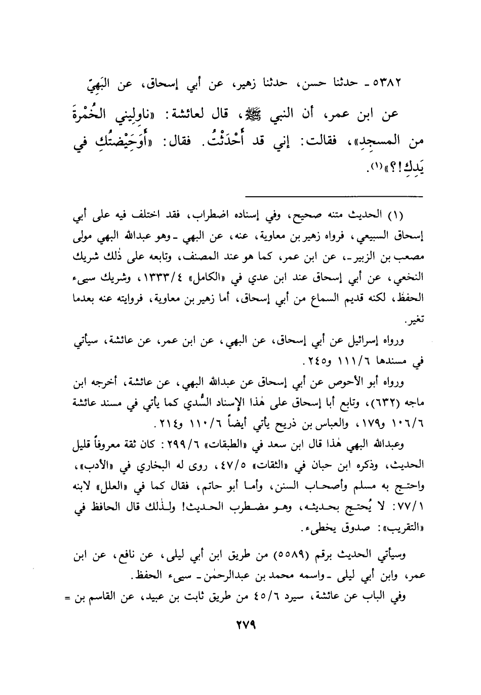 ٥٣٨٢ - حَدَّثَنَا حَسَنٌ، حَدَّثَنَا زُهَيْرٌ، عَنْ أَبِي إِسْحَاقَ، عَنِ الْبَهِيِّ، عَنِ ابْنِ عُمَرَ، أَنَّ النَّبِيَّ صَلَّى اللهُ عَلَيْهِ وَسَلَّمَ قَالَ لِعَائِشَةَ: " نَاوِلِينِي الْخُمْرَةَ مِنَ الْمَسْجِدِ " فَقَالَتْ: إِنِّي قَدْ أَحْدَثْتُ، فَقَالَ: " أَوَحَيْضَتُكِ فِي يَدِكِ؟ " (١)
