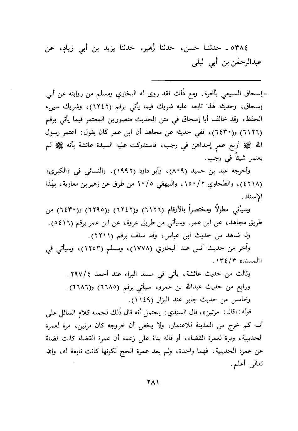 = إسحاق السبيعي بأخرة. ومع ذلك فقد روى له البخاري ومسلم من روايته عن أبي إسحاق، وحديثه هذا تابعه عليه شريك فيما يأتي برقم (٦٢٤٢) ، وشريك سيىء الحفظ، وقد خالف أبا إسحاق في متن الحديث منصور بن المعتمر فيما يأتي برقم (٦١٢٦) و (٦٤٣٠) ، ففي حديثه عن مجاهد أن ابن عمر كان يقول: اعتمر رسول الله صَلَّى اللهُ عَلَيْهِ وَسَلَّمَ أربع عمرٍ إحداهن في رجب، فاستدركت عليه السيدة عائشة بأنه صَلَّى اللهُ عَلَيْهِ وَسَلَّمَ لم يعتمر شيئاً في رجب.