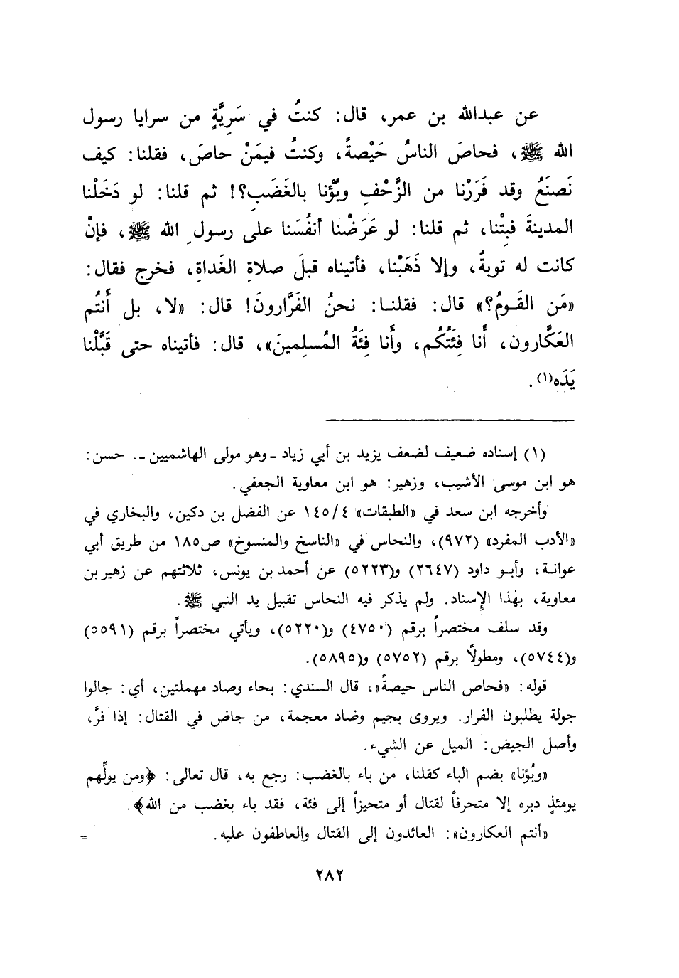 عَنْ عَبْدِ اللهِ بْنِ عُمَرَ قَالَ: كُنْتُ فِي سَرِيَّةٍ مِنْ سَرَايَا رَسُولِ اللهِ صَلَّى اللهُ عَلَيْهِ وَسَلَّمَ فَحَاصَ النَّاسُ حَيْصَةً، وَكُنْتُ فِيمَنْ حَاصَ فَقُلْنَا: كَيْفَ نَصْنَعُ؟ وَقَدْ فَرَرْنَا مِنَ الزَّحْفِ، وَبُؤْنَا بِالْغَضَبِ، ثُمَّ قُلْنَا: لَوْ دَخَلْنَا الْمَدِينَةَ فَبِتْنَا، ثُمَّ قُلْنَا: لَوْ عَرَضْنَا أَنْفُسَنَا عَلَى رَسُولِ اللهِ صَلَّى اللهُ عَلَيْهِ وَسَلَّمَ، فَإِنْ كَانَتْ لَهُ تَوْبَةٌ، وَإِلَّا ذَهَبْنَا فَأَتَيْنَاهُ قَبْلَ صَلَاةِ الْغَدَاةِ فَخَرَجَ، فَقَالَ: " مَنِ الْقَوْمُ؟ " قَالَ: فَقُلْنَا: نَحْنُ الْفَرَّارُونَ، قَالَ: " لَا بَلْ أَنْتُمُ الْعَكَّارُونَ، أَنَا فِئَتُكُمْ وَأَنَا فِئَةُ الْمُسْلِمِينَ " قَالَ: فَأَتَيْنَاهُ حَتَّى قَبَّلْنَا يَدَهُ (١)