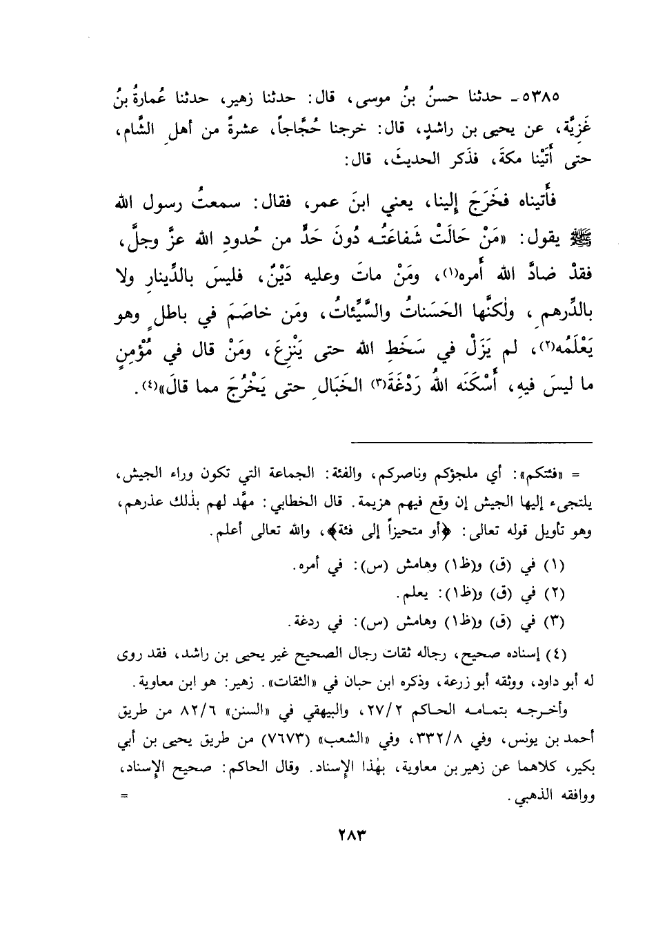 ٥٣٨٥ - حَدَّثَنَا حَسَنُ بْنُ مُوسَى قَالَ: حَدَّثَنَا زُهَيْرٌ، حَدَّثَنَا عُمَارَةُ بْنُ غَزِيَّةَ، عَنْ يَحْيَى بْنِ رَاشِدٍ قَالَ: خَرَجْنَا حُجَّاجًا عَشَرَةً مِنْ أَهْلِ الشَّامِ حَتَّى أَتَيْنَا مَكَّةَ، فَذَكَرَ الْحَدِيثَ قَالَ: فَأَتَيْنَاهُ فَخَرَجَ إِلَيْنَا يَعْنِي ابْنَ عُمَرَ فَقَالَ: سَمِعْتُ رَسُولَ اللهِ صَلَّى اللهُ عَلَيْهِ وَسَلَّمَ يَقُولُ: " مَنْ حَالَتْ شَفَاعَتُهُ دُونَ حَدٍّ مِنْ حُدُودِ اللهِ عَزَّ وَجَلَّ، فَقَدْ ضَادَّ اللهَ أَمْرَهُ، (١) وَمَنْ مَاتَ وَعَلَيْهِ دَيْنٌ، فَلَيْسَ بِالدِّينَارِ وَلَا بِالدِّرْهَمِ، وَلَكِنَّهَا الْحَسَنَاتُ وَالسَّيِّئَاتُ، وَمَنْ خَاصَمَ فِي بَاطِلٍ وَهُوَ يَعْلَمُهُ، (٢) لَمْ يَزَلْ فِي سَخَطِ اللهِ حَتَّى يَنْزِعَ، وَمَنْ قَالَ: فِي مُؤْمِنٍ مَا لَيْسَ فِيهِ أَسْكَنَهُ اللهُ رَدْغَةَ (٣) الْخَبَالِ حَتَّى يَخْرُجَ مِمَّا قَالَ " (٤)