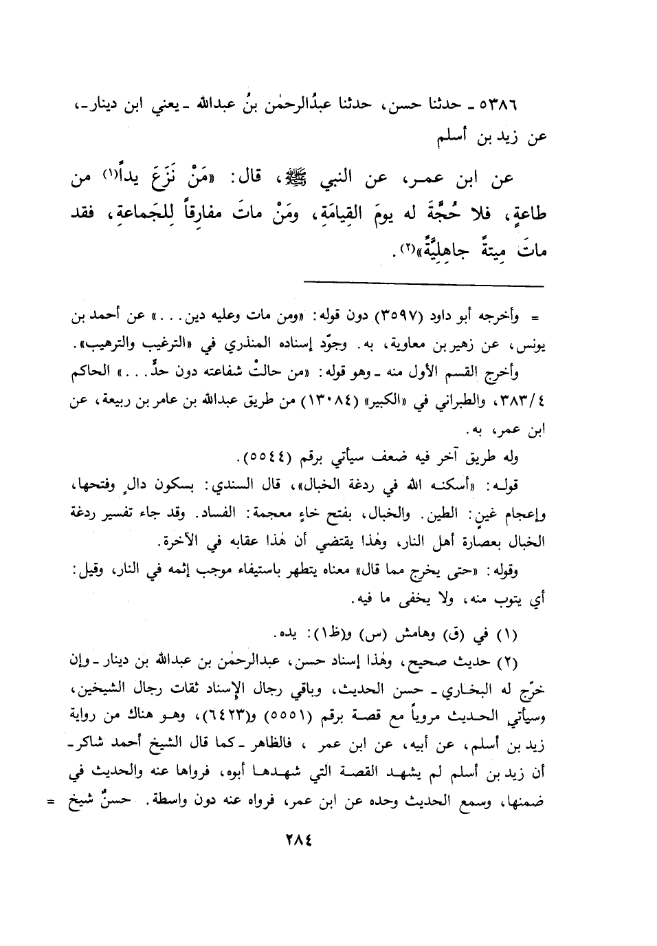 ٥٣٨٦ - حَدَّثَنَا حَسَنٌ، حَدَّثَنَا عَبْدُ الرَّحْمَنِ بْنُ عَبْدِ اللهِ يَعْنِي ابْنَ دِينَارٍ، عَنْ زَيْدِ بْنِ أَسْلَمَ، عَنِ ابْنِ عُمَرَ، عَنِ النَّبِيِّ صَلَّى اللهُ عَلَيْهِ وَسَلَّمَ قَالَ: " مَنْ نَزَعَ يَدًا (١) مِنْ طَاعَةٍ، فَلَا حُجَّةَ لَهُ يَوْمَ الْقِيَامَةِ، وَمَنْ مَاتَ مُفَارِقًا لِلْجَمَاعَةِ، فَقَدْ مَاتَ مِيتَةً جَاهِلِيَّةً " (٢)