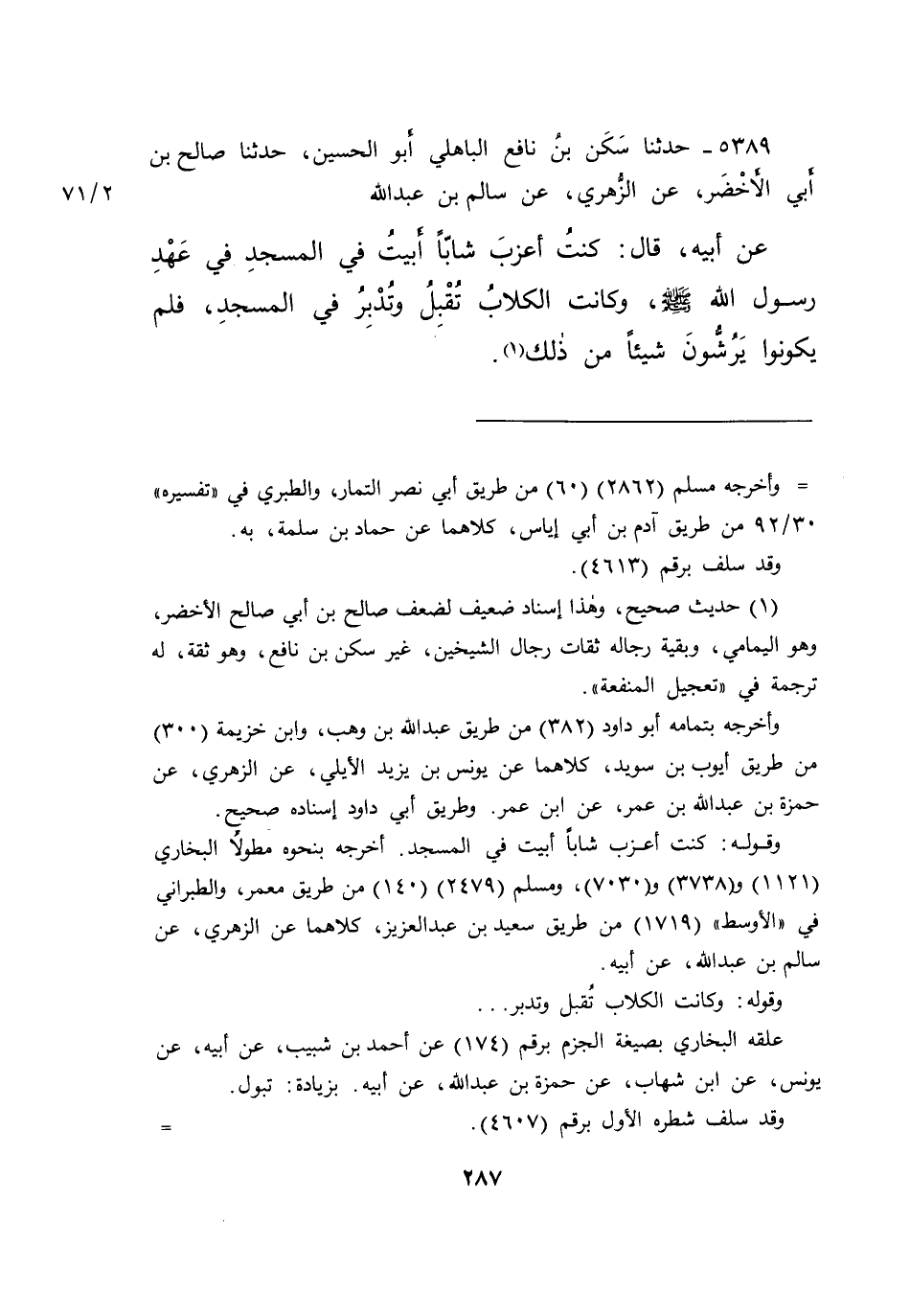 ٥٣٨٩ - حَدَّثَنَا سَكَنُ بْنُ نَافِعٍ الْبَاهِلِيُّ أَبُو الْحُسَيْنِ، حَدَّثَنَا صَالِحُ بْنُ أَبِي الْأَخْضَرِ، عَنِ الزُّهْرِيِّ، عَنْ سَالِمِ بْنِ عَبْدِ اللهِ، عَنْ أَبِيهِ قَالَ: " كُنْتُ أَعْزَبَ شَابًّا أَبِيتُ فِي الْمَسْجِدِ فِي عَهْدِ رَسُولِ اللهِ صَلَّى اللهُ عَلَيْهِ وَسَلَّمَ، وَكَانَتِ الْكِلَابُ تُقْبِلُ وَتُدْبِرُ فِي الْمَسْجِدِ، فَلَمْ يَكُونُوا يَرُشُّونَ شَيْئًا مِنْ ذَلِكَ " (١)