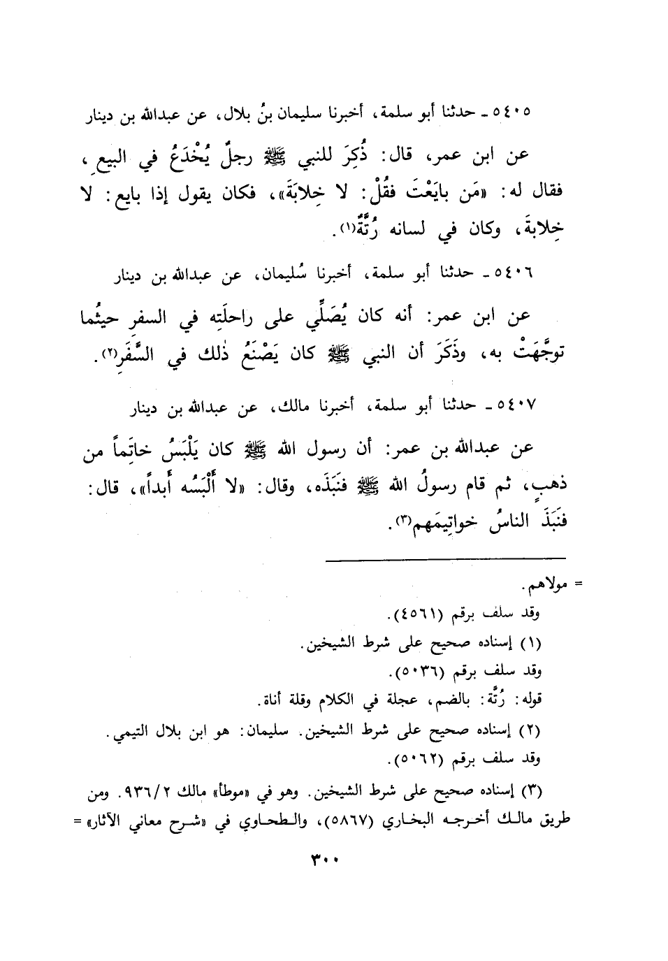 ٥٤٠٥ - حَدَّثَنَا أَبُو سَلَمَةَ، أَخْبَرَنَا سُلَيْمَانُ بْنُ بِلَالٍ، عَنْ عَبْدِ اللهِ بْنِ دِينَارٍ، عَنِ ابْنِ عُمَرَ قَالَ: ذُكِرَ لِلنَّبِيِّ صَلَّى اللهُ عَلَيْهِ وَسَلَّمَ رَجُلٌ يُخْدَعُ فِي الْبَيْعِ، فَقَالَ لَهُ: " مَنْ بَايَعْتَ فَقُلْ: لَا خِلَابَةَ " فَكَانَ يَقُولُ: إِذَا بَايَعَ لَا خِلَابَةَ وَكَانَ فِي لِسَانِهِ رُتَّةٌ (١)