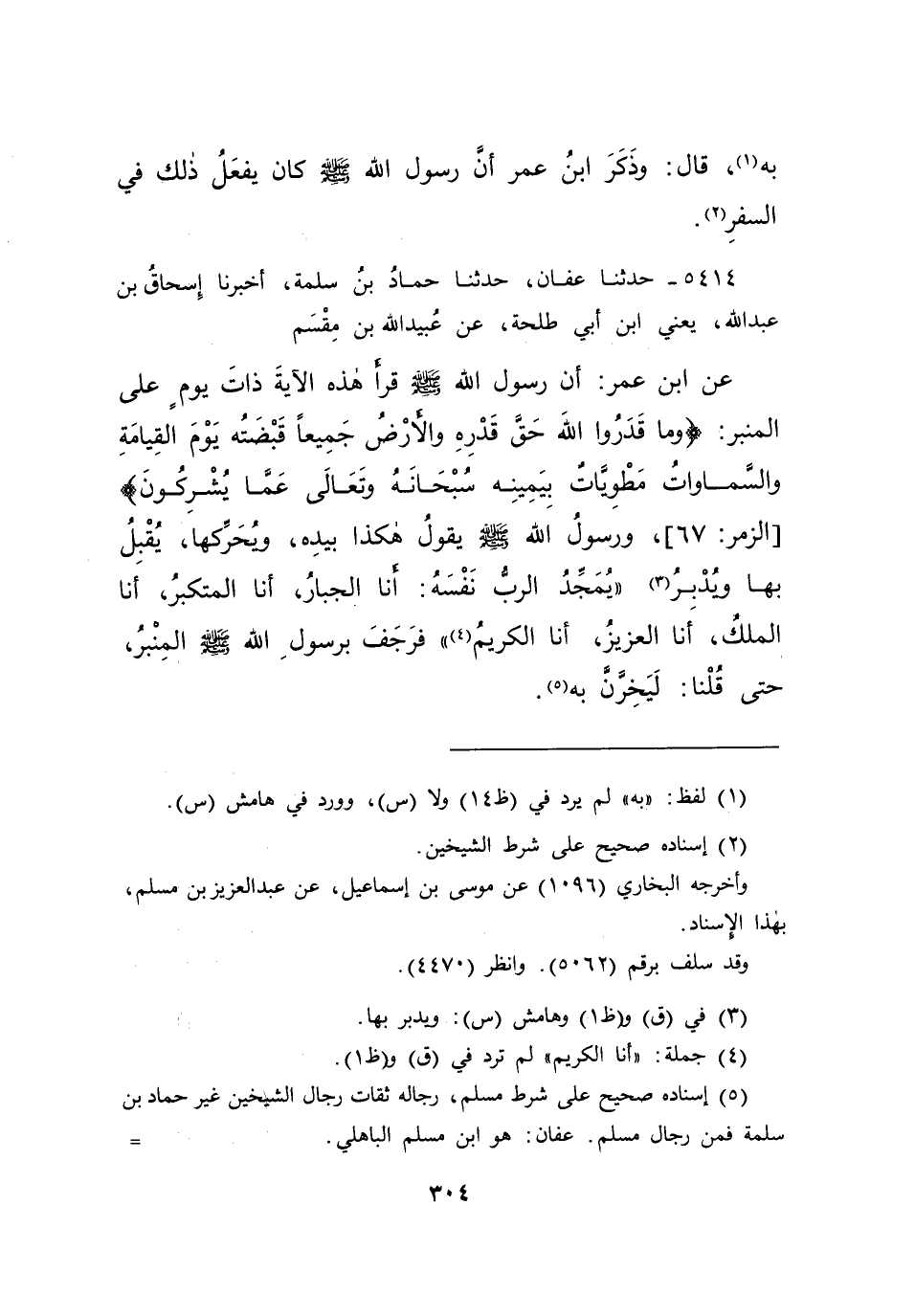 ٥٤١٤ - حَدَّثَنَا عَفَّانُ، حَدَّثَنَا حَمَّادُ بْنُ سَلَمَةَ، أَخْبَرَنَا إِسْحَاقُ بْنُ عَبْدِ اللهِ يَعْنِي ابْنَ أَبِي طَلْحَةَ، عَنْ عُبَيْدِ اللهِ بْنِ مِقْسَمٍ، عَنِ ابْنِ عُمَرَ، أَنَّ رَسُولَ اللهِ صَلَّى اللهُ عَلَيْهِ وَسَلَّمَ قَرَأَ هَذِهِ الْآيَةَ ذَاتَ يَوْمٍ عَلَى الْمِنْبَرِ: {وَمَا قَدَرُوا اللهَ حَقَّ قَدْرِهِ وَالْأَرْضُ جَمِيعًا قَبْضَتُهُ يَوْمَ الْقِيَامَةِ وَالسَّمَوَاتُ مَطْوِيَّاتٌ بِيَمِينِهِ سُبْحَانَهُ وَتَعَالَى عَمَّا يُشْرِكُونَ} ، وَرَسُولُ اللهِ صَلَّى اللهُ عَلَيْهِ وَسَلَّمَ يَقُولُ هَكَذَا بِيَدِهِ، وَيُحَرِّكُهَا، يُقْبِلُ بِهَا وَيُدْبِرُ: " (٣) يُمَجِّدُ الرَّبُّ نَفْسَهُ: أَنَا الْجَبَّارُ، أَنَا الْمُتَكَبِّرُ، أَنَا الْمَلِكُ، أَنَا الْعَزِيزُ، أَنَا الْكَرِيمُ " (٤) فَرَجَفَ بِرَسُولِ اللهِ صَلَّى اللهُ عَلَيْهِ وَسَلَّمَ الْمِنْبَرُ حَتَّى قُلْنَا: لَيَخِرَّنَّ بِهِ " (٥)