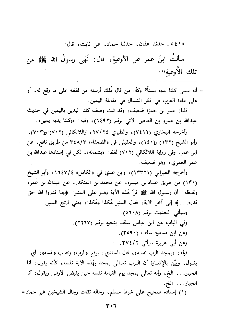 قلنا: عمر بن حمزة ضعيف، وقد ثبت وصف كلتا اليدين باليمين في حديث عبد الله بن عمرو بن العاص الآتي برقم (٦٤٩٢) ، وفيه:"وكلتا يديه يمين".