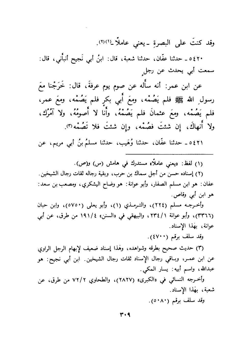 ٥٤٢٠ - حَدَّثَنَا عَفَّانُ، حَدَّثَنَا شُعْبَةُ، قَالَ ابْنُ أَبِي نَجِيحٍ، أَنْبَأَنِي قَالَ: سَمِعْتُ أَبِي يُحَدِّثُ عَنْ رَجُلٍ، عَنِ ابْنِ عُمَرَ، أَنَّهُ سَأَلَهُ عَنْ صَوْمِ يَوْمِ عَرَفَةَ، قَالَ: " خَرَجْنَا مَعَ رَسُولِ اللهِ صَلَّى اللهُ عَلَيْهِ وَسَلَّمَ فَلَمْ يَصُمْهُ، وَمَعَ أَبِي بَكْرٍ فَلَمْ يَصُمْهُ، وَمَعَ عُمَرَ فَلَمْ يَصُمْهُ، وَمَعَ عُثْمَانَ فَلَمْ يَصُمْهُ، وَأَنَا لَا أَصُومُهُ وَلَا آمُرُكَ وَلَا أَنْهَاكَ، إِنْ شِئْتَ فَصُمْهُ، وَإِنْ شِئْتَ فَلَا تَصُمْهُ (٣)