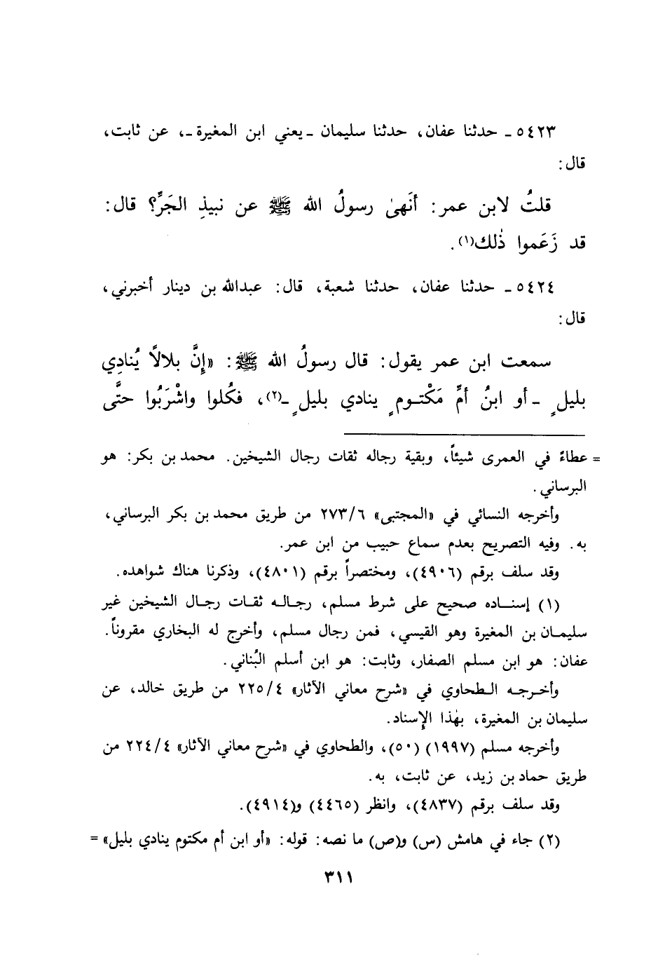 ٥٤٢٤ - حَدَّثَنَا عَفَّانُ، حَدَّثَنَا شُعْبَةُ، قَالَ عَبْدُ اللهِ بْنُ دِينَارٍ: أَخْبَرَنِي قَالَ: سَمِعْتُ ابْنَ عُمَرَ يَقُولُ: قَالَ رَسُولُ اللهِ صَلَّى اللهُ عَلَيْهِ وَسَلَّمَ: " إِنَّ بِلَالًا يُنَادِي بِلَيْلٍ، أَوِ ابْنُ أُمِّ مَكْتُومٍ يُنَادِي بِلَيْلٍ، (٢) فَكُلُوا وَاشْرَبُوا حَتَّى