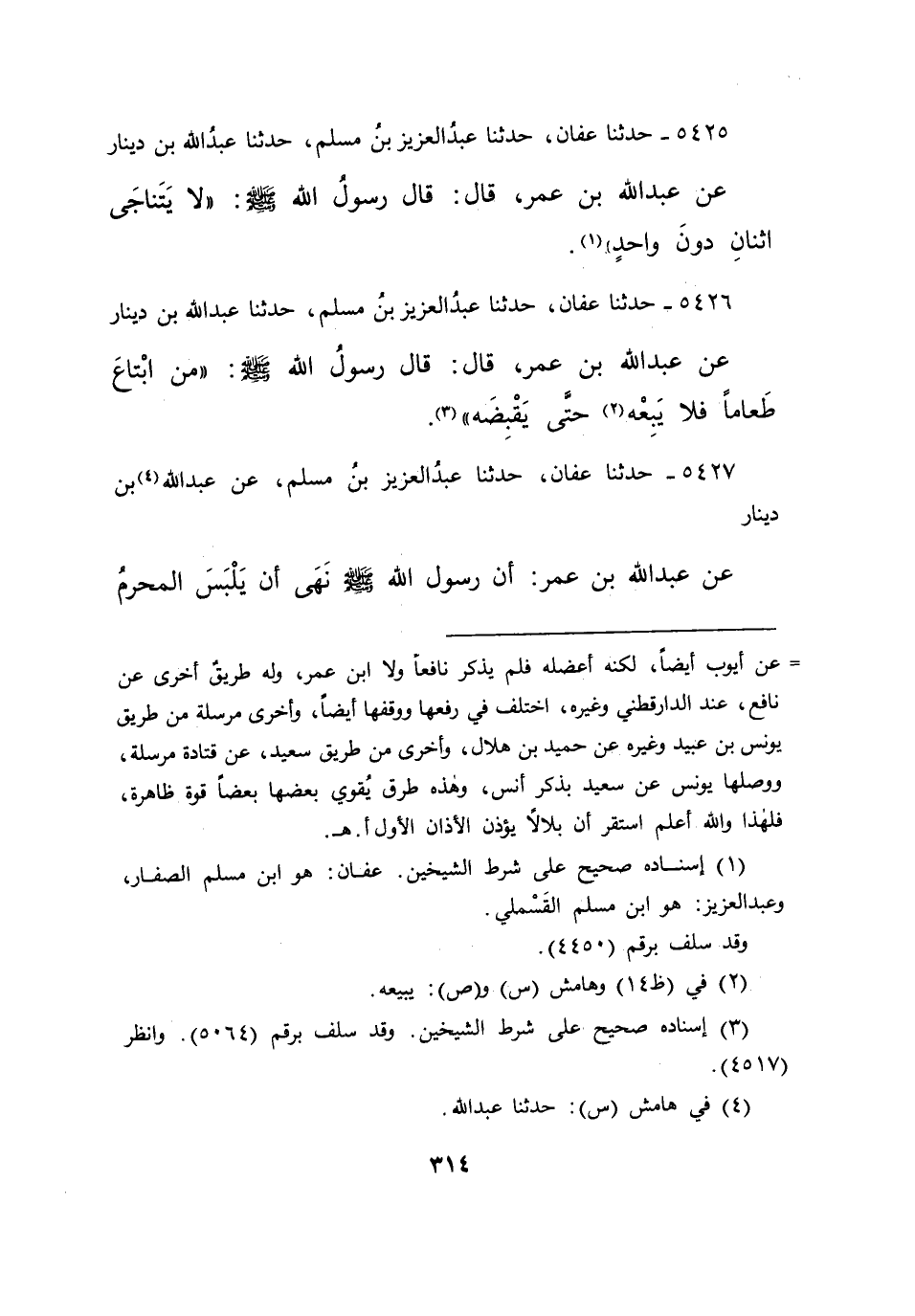 ٥٤٢٦ - حَدَّثَنَا عَفَّانُ، حَدَّثَنَا عَبْدُ الْعَزِيزِ بْنُ مُسْلِمٍ، حَدَّثَنَا عَبْدُ اللهِ بْنُ دِينَارٍ، عَنْ عَبْدِ اللهِ بْنِ عُمَرَ قَالَ: قَالَ رَسُولُ اللهِ صَلَّى اللهُ عَلَيْهِ وَسَلَّمَ: " مَنِ ابْتَاعَ طَعَامًا فَلَا يَبِعْهُ (٢) حَتَّى يَقْبِضَهُ " (٣)