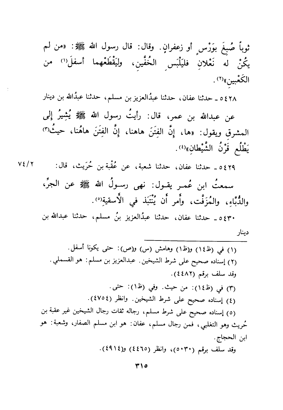 ٥٤٢٨ - حَدَّثَنَا عَفَّانُ، حَدَّثَنَا عَبْدُ الْعَزِيزِ بْنُ مُسْلِمٍ، حَدَّثَنَا عَبْدُ اللهِ بْنُ دِينَارٍ، عَنْ عَبْدِ اللهِ بْنِ عُمَرَ قَالَ: رَأَيْتُ رَسُولَ اللهِ صَلَّى اللهُ عَلَيْهِ وَسَلَّمَ يُشِيرُ إِلَى الْمَشْرِقِ وَيَقُولُ: " هَا إِنَّ الْفِتَنَ هَاهُنَا، إِنَّ الْفِتَنَ هَاهُنَا حَيْثُ (٣) يَطْلُعُ قَرْنُ الشَّيْطَانِ " (٤)