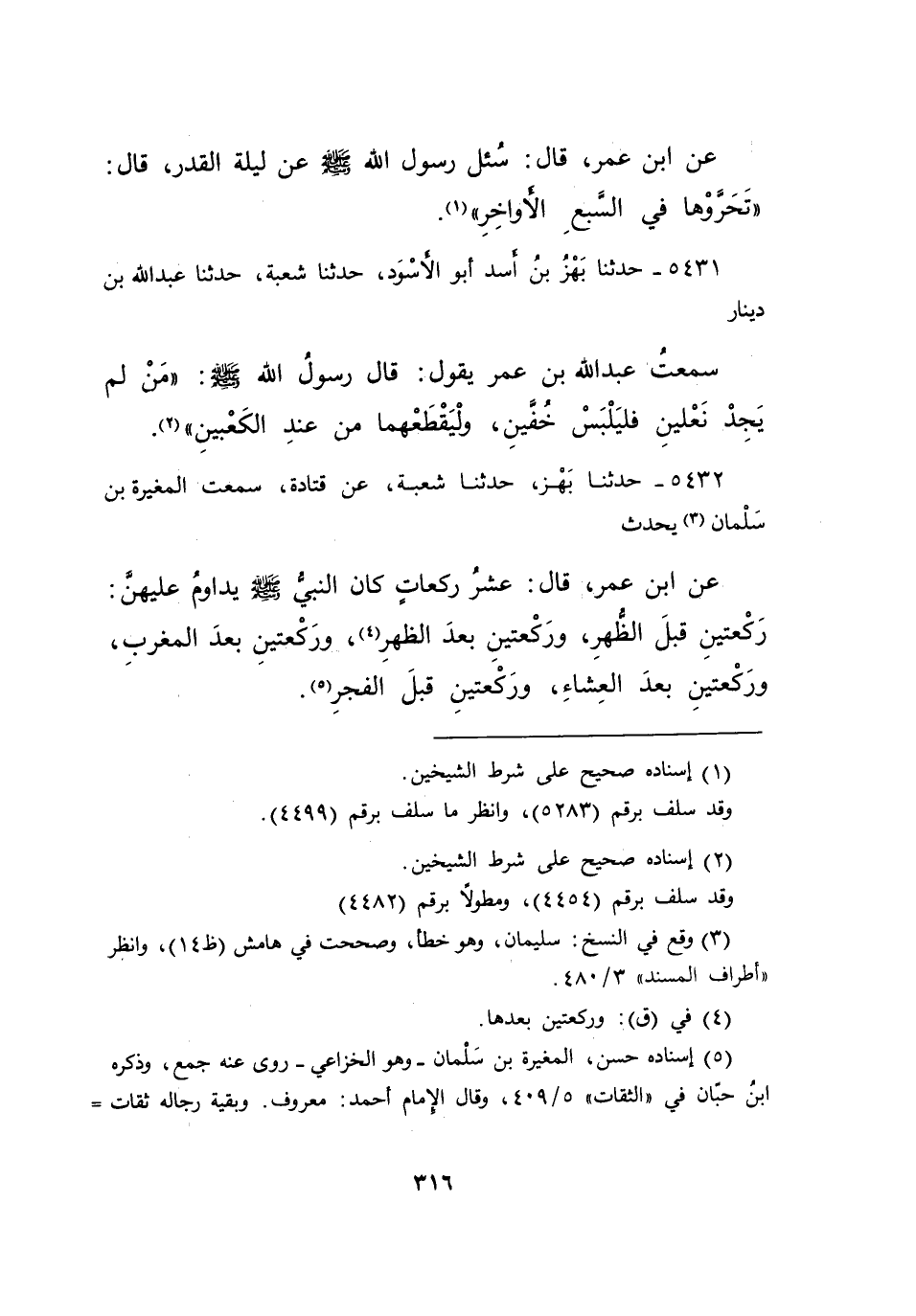 ٥٤٣٢ - حَدَّثَنَا بَهْزٌ، حَدَّثَنَا شُعْبَةُ، عَنْ قَتَادَةَ، سَمِعْتُ الْمُغِيرَةَ بْنَ سَلْمَانَ، (٣) يُحَدِّثُ عَنِ ابْنِ عُمَرَ قَالَ: " عَشْرُ رَكَعَاتٍ كَانَ النَّبِيُّ صَلَّى اللهُ عَلَيْهِ وَسَلَّمَ يُدَاوِمُ عَلَيْهِنَّ رَكْعَتَيْنِ قَبْلَ الظُّهْرِ وَرَكْعَتَيْنِ بَعْدَ الظُّهْرِ، (٤) وَرَكْعَتَيْنِ بَعْدَ الْمَغْرِبِ، وَرَكْعَتَيْنِ بَعْدَ الْعِشَاءِ، وَرَكْعَتَيْنِ قَبْلَ الْفَجْرِ " (٥)