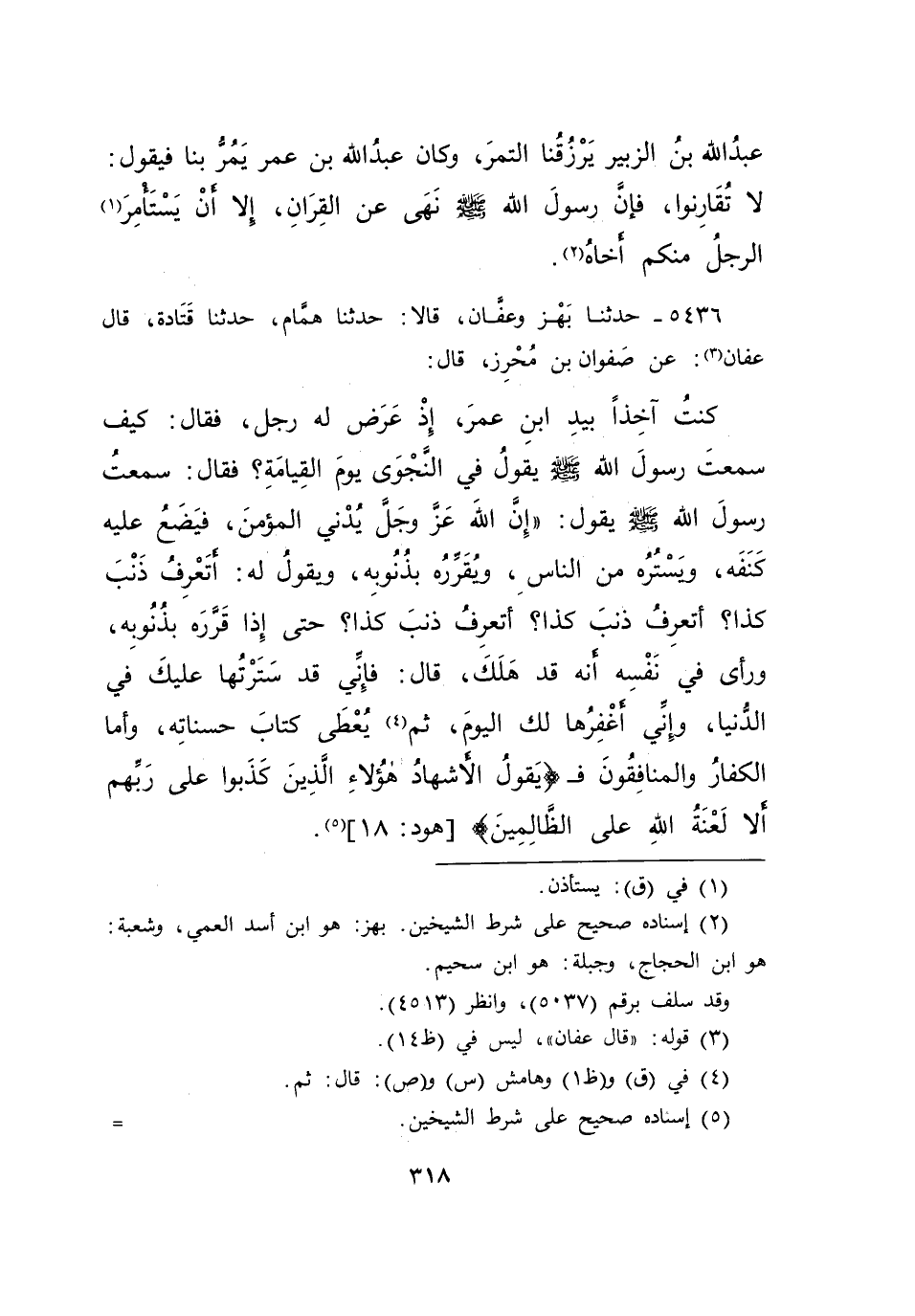 ٥٤٣٦ - حَدَّثَنَا بَهْزٌ، وَعَفَّانُ قَالَا: حَدَّثَنَا هَمَّامٌ، حَدَّثَنَا قَتَادَةُ، قَالَ عَفَّانُ: (٣) عَنْ صَفْوَانَ بْنِ مُحْرِزٍ قَالَ: كُنْتُ آخِذًا بِيَدِ ابْنِ عُمَرَ إِذْ عَرَضَ لَهُ رَجُلٌ، فَقَالَ: كَيْفَ سَمِعْتَ رَسُولَ اللهِ صَلَّى اللهُ عَلَيْهِ وَسَلَّمَ يَقُولُ: فِي النَّجْوَى يَوْمَ الْقِيَامَةِ؟ فَقَالَ: سَمِعْتُ رَسُولَ اللهِ صَلَّى اللهُ عَلَيْهِ وَسَلَّمَ يَقُولُ: " إِنَّ اللهَ عَزَّ وَجَلَّ يُدْنِي الْمُؤْمِنَ، فَيَضَعُ عَلَيْهِ كَنَفَهُ وَيَسْتُرُهُ مِنَ النَّاسِ، وَيُقَرِّرُهُ بِذُنُوبِهِ، وَيَقُولُ لَهُ: أَتَعْرِفُ ذَنْبَ كَذَا، أَتَعْرِفُ ذَنْبَ كَذَا، أَتَعْرِفُ ذَنْبَ كَذَا، حَتَّى إِذَا قَرَّرَهُ بِذُنُوبِهِ، وَرَأَى فِي نَفْسِهِ أَنَّهُ قَدْ هَلَكَ، قَالَ: فَإِنِّي قَدْ سَتَرْتُهَا عَلَيْكَ فِي الدُّنْيَا، وَإِنِّي أَغْفِرُهَا لَكَ الْيَوْمَ، ثُمَّ (٤) يُعْطَى كِتَابَ حَسَنَاتِهِ، وَأَمَّا الْكُفَّارُ وَالْمُنَافِقُونَ، فَيَقُولُ الْأَشْهَادُ ": {هَؤُلَاءِ الَّذِينَ كَذَبُوا عَلَى رَبِّهِمْ أَلَا لَعْنَةُ اللهِ عَلَى الظَّالِمِينَ} [هود: ١٨] (٥)
