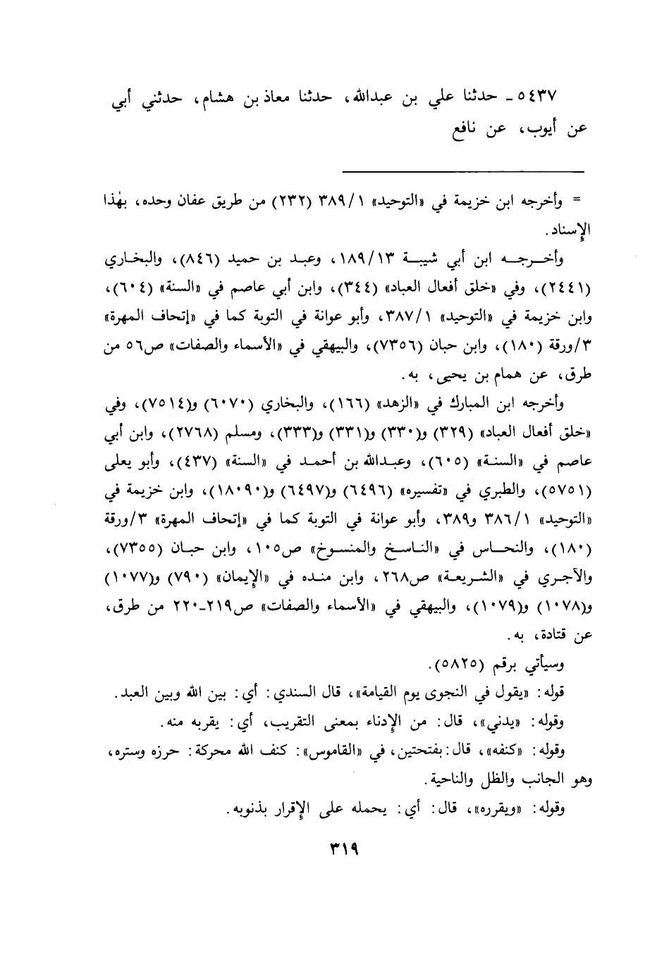 وأخرجه ابن أبي شيبة ١٣/١٨٩، وعبد بن حميد (٨٤٦) ، والبخاري (٢٤٤١) ، وفي "خلق أفعال العباد" (٣٤٤) ، وابن أبي عاصم في "السنة" (٦٠٤) ، واين خزيمة في "التوحيد"١/٣٨٧، وأبو عوانة في التوبة كما في "إتحاف المهرة" ٣/ورقة (١٨٠) ، وابن حبان (٧٣٥٦) ، والبيهقي في "الأسماء والصفات"ص ٥٦ من طرق، عن همام بن يحيى، به.
