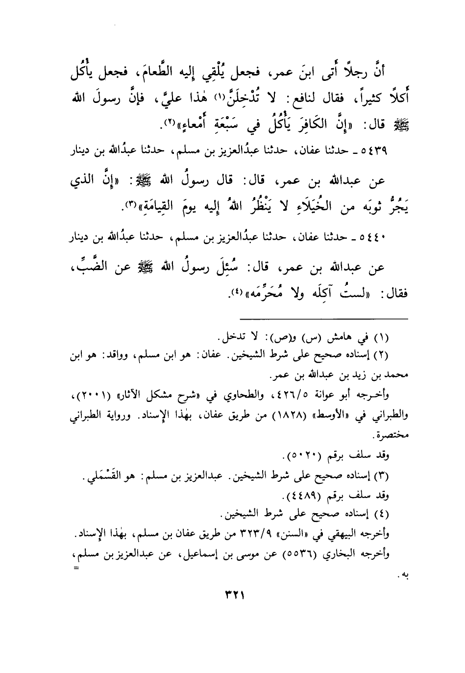 أَنَّ رَجُلًا أَتَى ابْنَ عُمَرَ فَجَعَلَ يُلْقِي إِلَيْهِ الطَّعَامَ، فَجَعَلَ يَأْكُلُ أَكْلًا كَثِيرًا، فَقَالَ لِنَافِعٍ: لَا تُدْخِلَنَّ (١) هَذَا عَلَيَّ، فَإِنَّ رَسُولَ اللهِ صَلَّى اللهُ عَلَيْهِ وَسَلَّمَ قَالَ: " إِنَّ الْكَافِرَ يَأْكُلُ فِي سَبْعَةِ أَمْعَاءٍ " (٢)