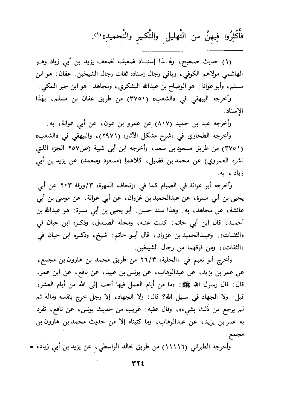وأخرج أبو نعيم في "الحلية"٣/٢٦ من طريق محمد بن هارون بن مجمع، عن عمر بن يزيد، عن عبد الوهاب، عن يونس بن عبيد، عن نافع، عن ابن عمر، قال: قال رسول الله صَلَّى اللهُ عَلَيْهِ وَسَلَّمَ:"ما من أيام العمل فيها أحب إلى الله من أيام العشر، قيل: ولا الجهاد في سبيل الله؟ قال: ولا الجهاد، إلا رجل خرج بنفسه وماله ثم لم يرجع من ذلك بشيء"، وقال عقبه: غريب من حديث يونس، عن نافع، تفرد به عمر بن يزيد، عن عبد الوهاب: وما كتبناه إلا من حديث محمد بن هارون بن مجمع.