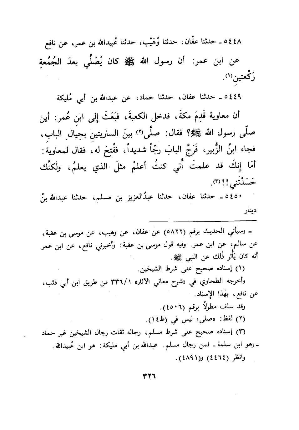 ٥٤٤٩ - حَدَّثَنَا عَفَّانُ، حَدَّثَنَا حَمَّادٌ، عَنْ عَبْدِ اللهِ بْنِ أَبِي مُلَيْكَةَ، أَنَّ مُعَاوِيَةَ قَدِمَ مَكَّةَ فَدَخَلَ الْكَعْبَةَ، فَبَعَثَ إِلَى ابْنِ عُمَرَ أَيْنَ صَلَّى رَسُولُ اللهِ صَلَّى اللهُ عَلَيْهِ وَسَلَّمَ؟ فَقَالَ: " صَلَّى (٢) بَيْنَ السَّارِيَتَيْنِ بِحِيَالِ الْبَابِ " فَجَاءَ ابْنُ الزُّبَيْرِ فَرَجَّ الْبَابَ رَجًّا شَدِيدًا فَفُتِحَ لَهُ، فَقَالَ لِمُعَاوِيَةَ: أَمَا إِنَّكَ قَدْ عَلِمْتَ أَنِّي كُنْتُ أَعْلَمُ مِثْلَ الَّذِي يَعْلَمُ وَلَكِنَّكَ حَسَدْتَنِي (٣)