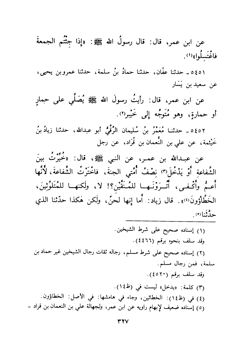 ٥٤٥٢ - حَدَّثَنَا مُعَمَّرُ بْنُ سُلَيْمَانَ الرَّقِّيُّ أَبُو عَبْدِ اللهِ، حَدَّثَنَا زِيَادُ بْنُ خَيْثَمَةَ، عَنْ عَلِيِّ بْنِ النُّعْمَانِ بْنِ قُرَادٍ، عَنْ رَجُلٍ، عَنْ عَبْدِ اللهِ بْنِ عُمَرَ، عَنِ النَّبِيِّ صَلَّى اللهُ عَلَيْهِ وَسَلَّمَ قَالَ: " خُيِّرْتُ بَيْنَ الشَّفَاعَةِ، أَوْ يَدْخُلُ (٣) نِصْفُ أُمَّتِي الْجَنَّةَ، فَاخْتَرْتُ الشَّفَاعَةَ، لِأَنَّهَا أَعَمُّ وَأَكْفَى، أَتُرَوْنَهَا لِلْمُنَقَّيْنَ، لَا وَلَكِنَّهَا لِلْمُتَلَوِّثِينَ الْخَطَّاءُونَ " (٤) قَالَ زِيَادٌ: " أَمَا إِنَّهَا لَحْنٌ وَلَكِنْ هَكَذَا حَدَّثَنَا الَّذِي حَدَّثَنَا " (٥)