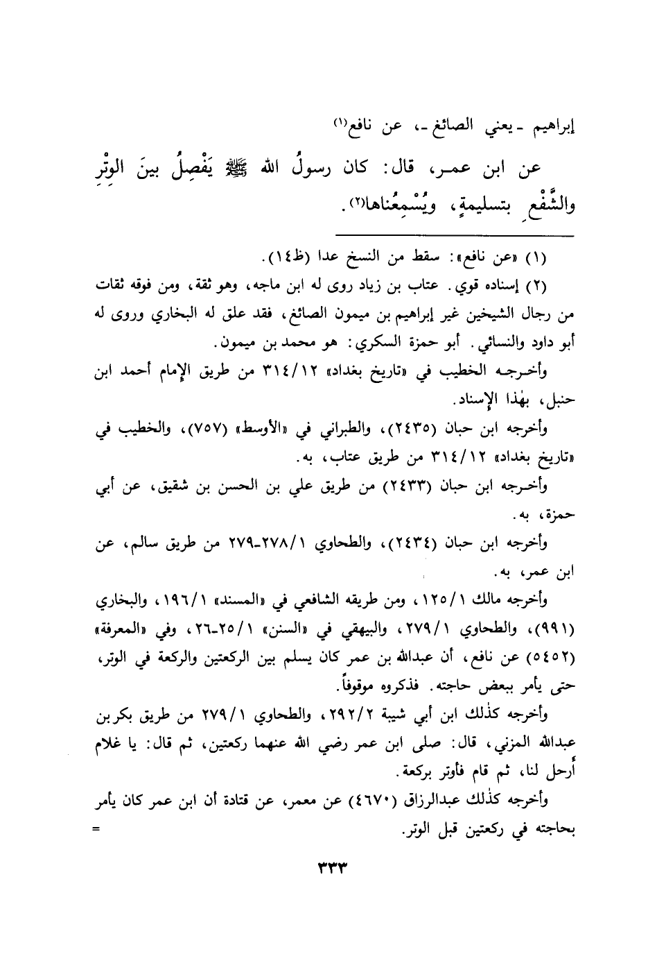إِبْرَاهِيمَ يَعْنِي الصَّائِغَ، عَنِ نَافِعٍ، (١) عَنْ ابْنِ عُمَرَ قَالَ: " كَانَ رَسُولُ اللهِ صَلَّى اللهُ عَلَيْهِ وَسَلَّمَ يَفْصِلُ بَيْنَ الْوَتْرِ وَالشَّفْعِ بِتَسْلِيمَةٍ وَيُسْمِعُنَاهَا " (٢)