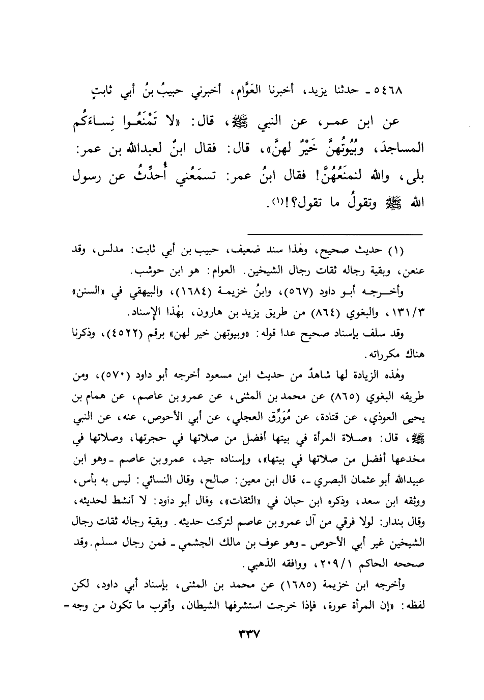 ٥٤٦٨ - حَدَّثَنَا يَزِيدُ، أَخْبَرَنَا الْعَوَّامُ، أَخْبَرَنِي حَبِيبُ بْنُ أَبِي ثَابِتٍ، عَنْ ابْنِ عُمَرَ، عَنِ النَّبِيِّ صَلَّى اللهُ عَلَيْهِ وَسَلَّمَ قَالَ: " لَا تَمْنَعُوا نِسَاءَكُمُ الْمَسَاجِدَ، وَبُيُوتُهُنَّ خَيْرٌ لَهُنَّ " قَالَ: فَقَالَ ابْنٌ لِعَبْدِ اللهِ بْنِ عُمَرَ: بَلَى وَاللهِ لَنَمْنَعُهُنَّ، فَقَالَ ابْنُ عُمَرَ: " تَسْمَعُنِي أُحَدِّثُ عَنْ رَسُولِ اللهِ صَلَّى اللهُ عَلَيْهِ وَسَلَّمَ وَتَقُولُ: مَا تَقُولُ " (١)