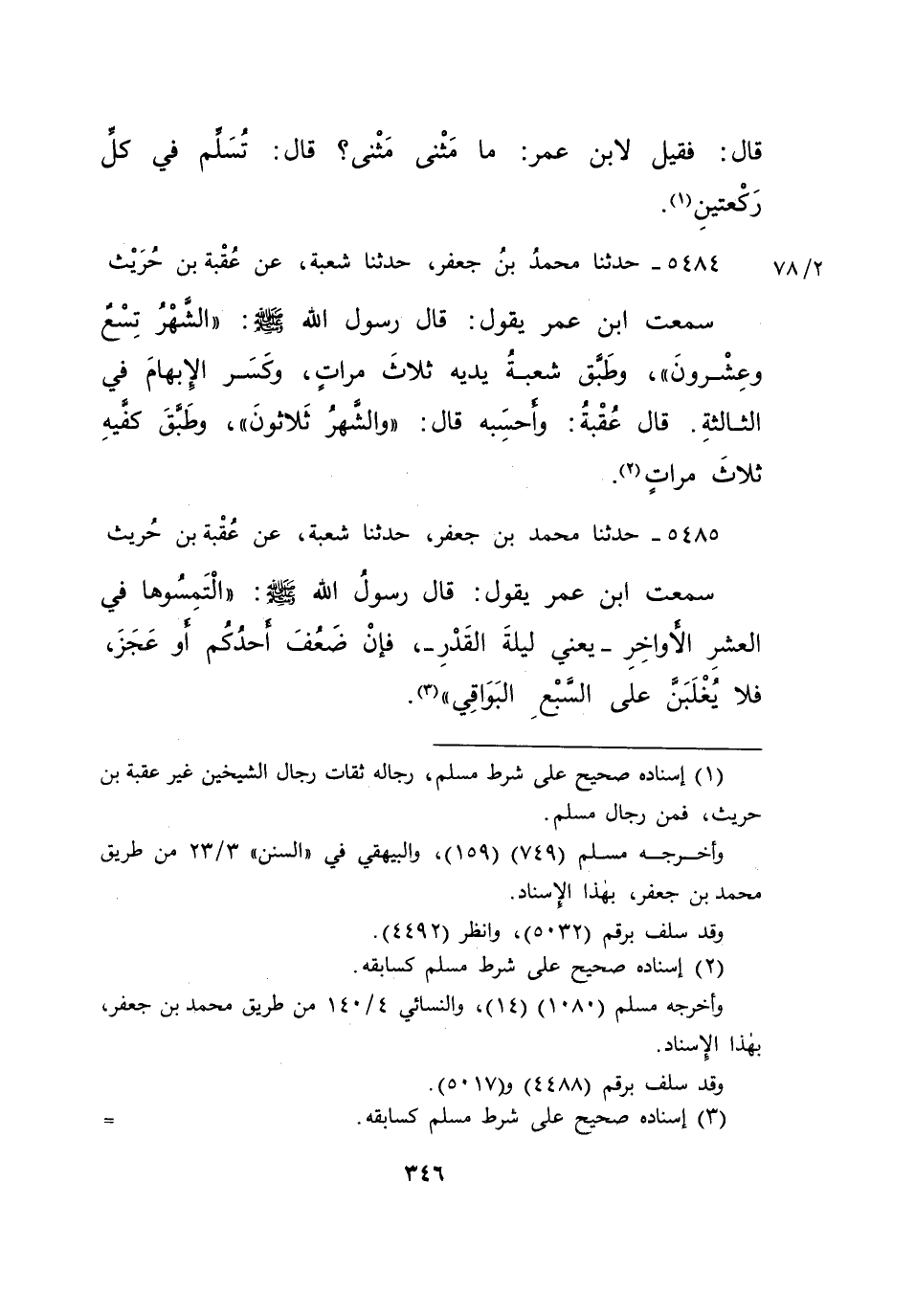 ٥٤٨٥ - حَدَّثَنَا مُحَمَّدُ بْنُ جَعْفَرٍ، حَدَّثَنَا شُعْبَةُ، عَنْ عُقْبَةَ بْنِ حُرَيْثٍ، سَمِعْتُ ابْنَ عُمَرَ يَقُولُ: قَالَ رَسُولُ اللهِ صَلَّى اللهُ عَلَيْهِ وَسَلَّمَ: " الْتَمِسُوهَا فِي الْعَشْرِ الْأَوَاخِرِ - يَعْنِي لَيْلَةَ الْقَدْرِ - فَإِنْ ضَعُفَ أَحَدُكُمْ أَوْ عَجَزَ، فَلَا يُغْلَبَنَّ عَلَى السَّبْعِ الْبَوَاقِي " (٣)