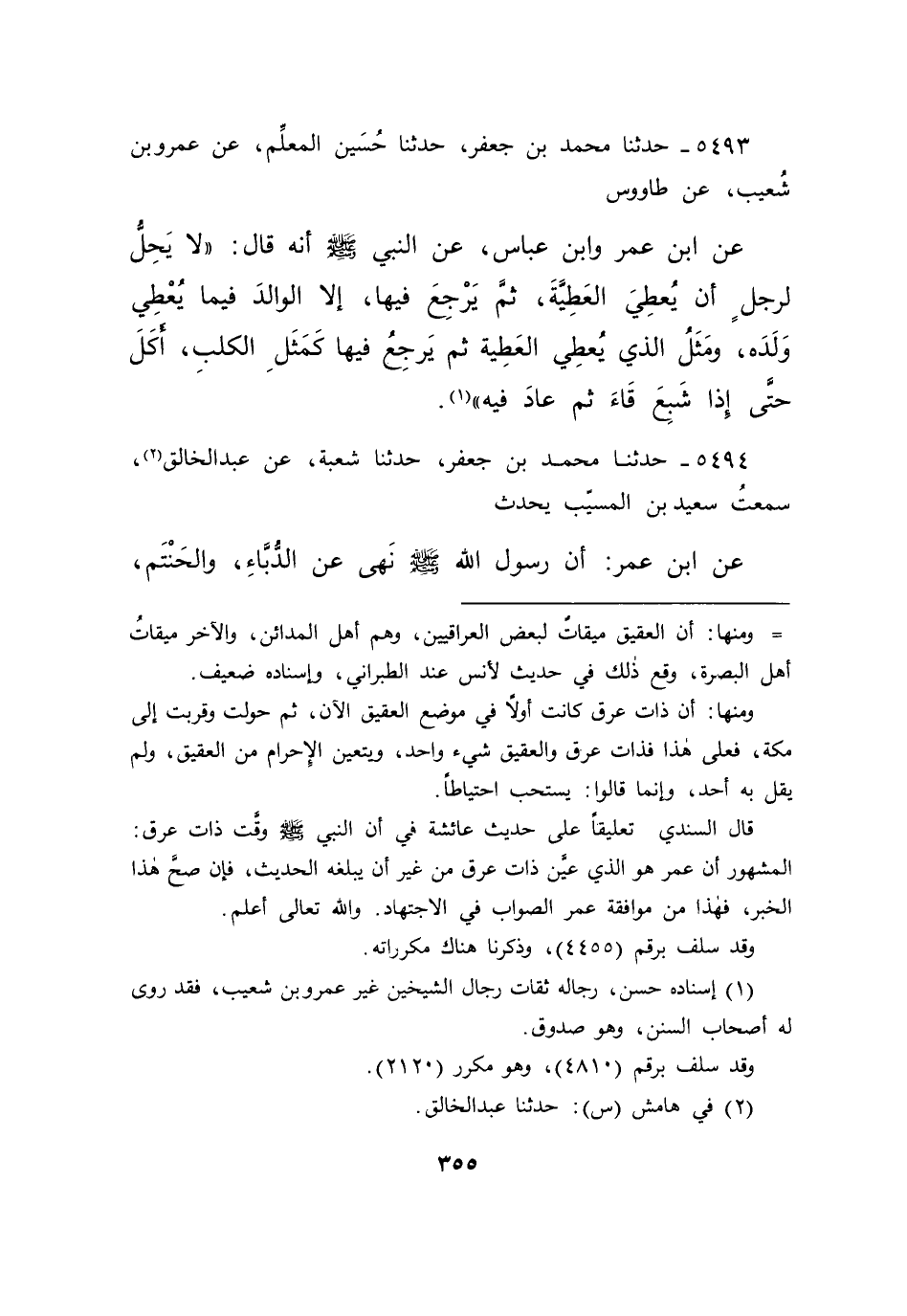 ٥٤٩٣ - حَدَّثَنَا مُحَمَّدُ بْنُ جَعْفَرٍ، حَدَّثَنَا حُسَيْنٌ الْمُعَلِّمُ، عَنْ عَمْرِو بْنِ شُعَيْبٍ، عَنْ طَاوُسٍ، عَنِ ابْنِ عُمَرَ، وَابْنِ عَبَّاسٍ عَنِ النَّبِيِّ صَلَّى اللهُ عَلَيْهِ وَسَلَّمَ أَنَّهُ قَالَ: " لَا يَحِلُّ لِرَجُلٍ أَنْ يُعْطِيَ الْعَطِيَّةَ ثُمَّ يَرْجِعَ فِيهَا، إِلَّا الْوَالِدَ فِيمَا يُعْطِي وَلَدَهُ، وَمَثَلُ الَّذِي يُعْطِي الْعَطِيَّةَ ثُمَّ يَرْجِعُ فِيهَا، كَمَثَلِ الْكَلْبِ أَكَلَ حَتَّى إِذَا شَبِعَ قَاءَ ثُمَّ عَادَ فِيهِ " (١)
