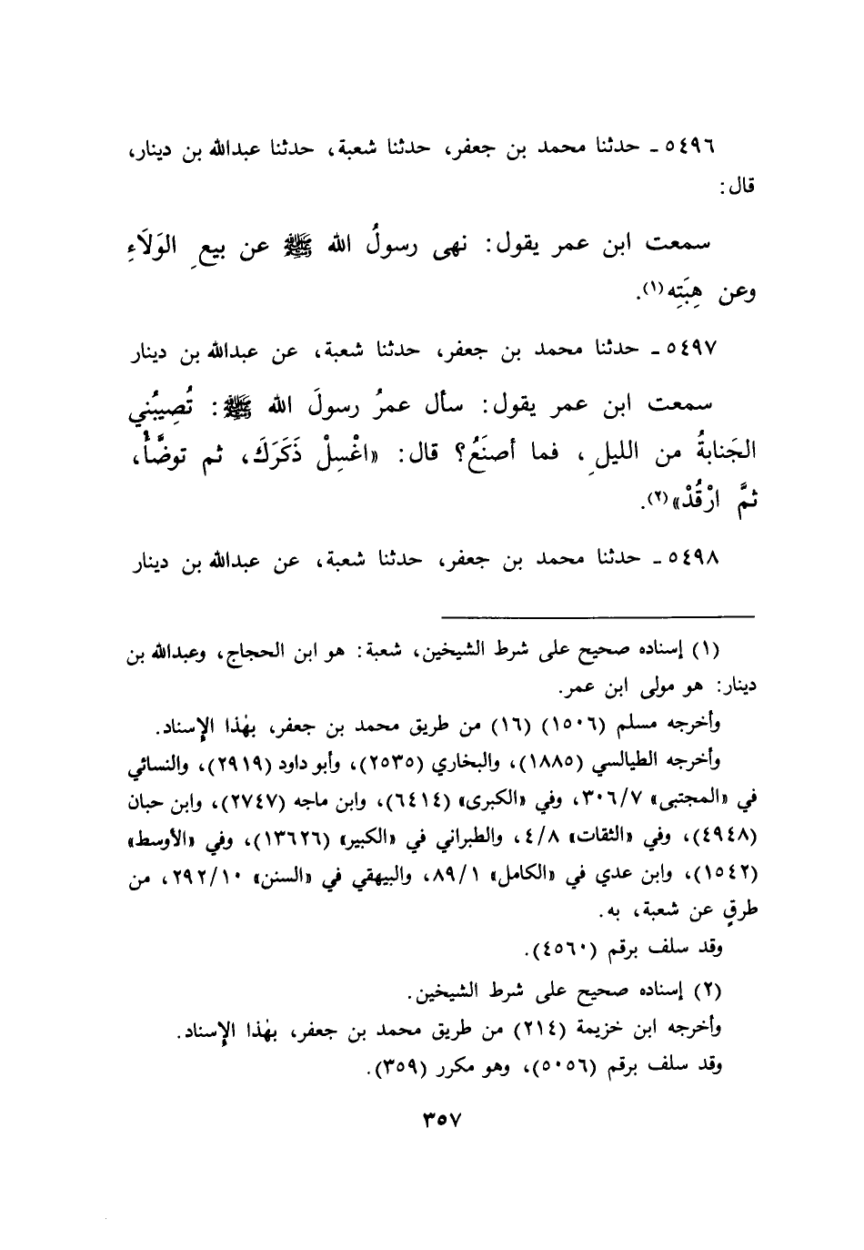 ٥٤٩٦ - حَدَّثَنَا مُحَمَّدُ بْنُ جَعْفَرٍ، حَدَّثَنَا شُعْبَةُ، حَدَّثَنَا عَبْدُ اللهِ بْنُ دِينَارٍ قَالَ: سَمِعْتُ ابْنَ عُمَرَ يَقُولُ: " نَهَى رَسُولُ اللهِ صَلَّى اللهُ عَلَيْهِ وَسَلَّمَ عَنْ بَيْعِ الْوَلَاءِ، وَعَنْ هِبَتِهِ " (١)