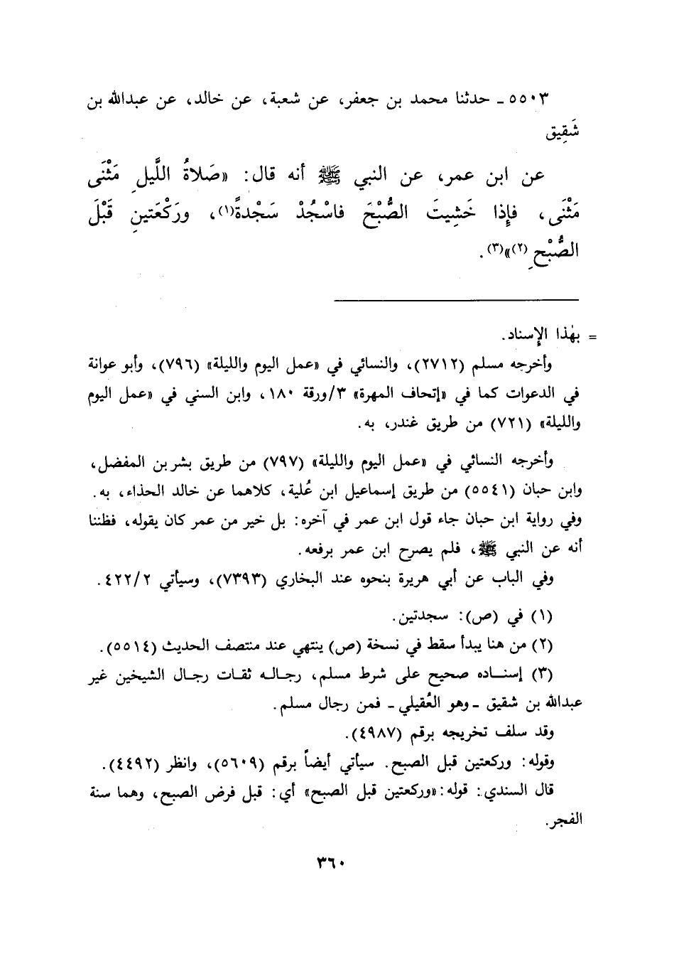 ٥٥٠٣ - حَدَّثَنَا مُحَمَّدُ بْنُ جَعْفَرٍ، عَنْ شُعْبَةَ، عَنْ خَالِدٍ، عَنْ عَبْدِ اللهِ بْنِ شَقِيقٍ، عَنِ ابْنِ عُمَرَ، عَنِ النَّبِيِّ صَلَّى اللهُ عَلَيْهِ وَسَلَّمَ أَنَّهُ قَالَ: " صَلَاةُ اللَّيْلِ مَثْنَى مَثْنَى، فَإِذَا خَشِيتَ الصُّبْحَ، فَاسْجُدْ سَجْدَةً (١) وَرَكْعَتَيْنِ قَبْلَ الصُّبْحِ (٢) " (٣)
