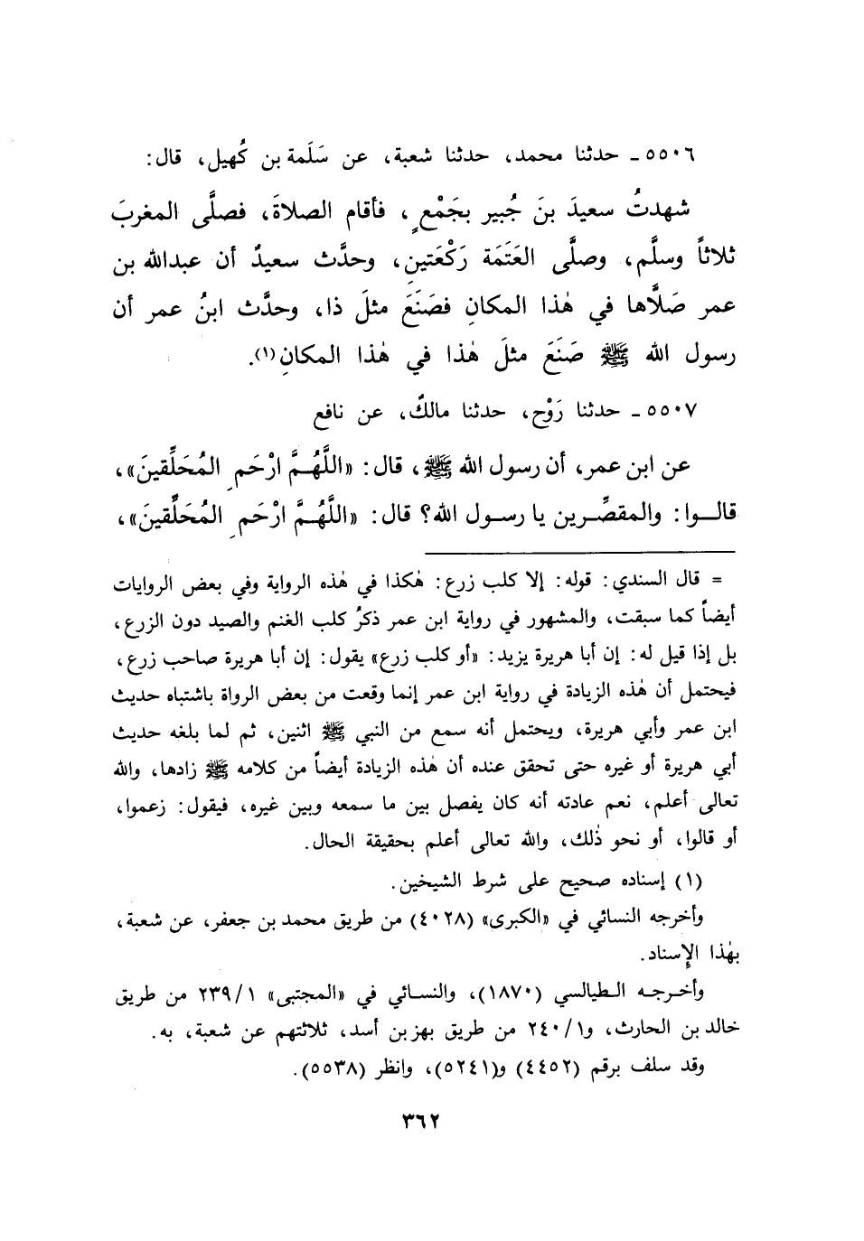 ٥٥٠٦ - حَدَّثَنَا مُحَمَّدٌ، حَدَّثَنَا شُعْبَةُ، عَنْ سَلَمَةَ بْنِ كُهَيْلٍ قَالَ: شَهِدْتُ سَعِيدَ بْنَ جُبَيْرٍ بِجَمْعٍ فَأَقَامَ الصَّلَاةَ، فَصَلَّى الْمَغْرِبَ ثَلَاثًا وَسَلَّمَ، وَصَلَّى الْعَتَمَةَ رَكْعَتَيْنِ، وَحَدَّثَ سَعِيدٌ أَنَّ عَبْدَ اللهِ بْنَ عُمَرَ صَلَّاهَا فِي هَذَا الْمَكَانِ فَصَنَعَ مِثْلَ ذَا، وَحَدَّثَ ابْنُ عُمَرَ " أَنَّ رَسُولَ اللهِ صَلَّى اللهُ عَلَيْهِ وَسَلَّمَ صَنَعَ مِثْلَ هَذَا فِي هَذَا الْمَكَانِ " (١)