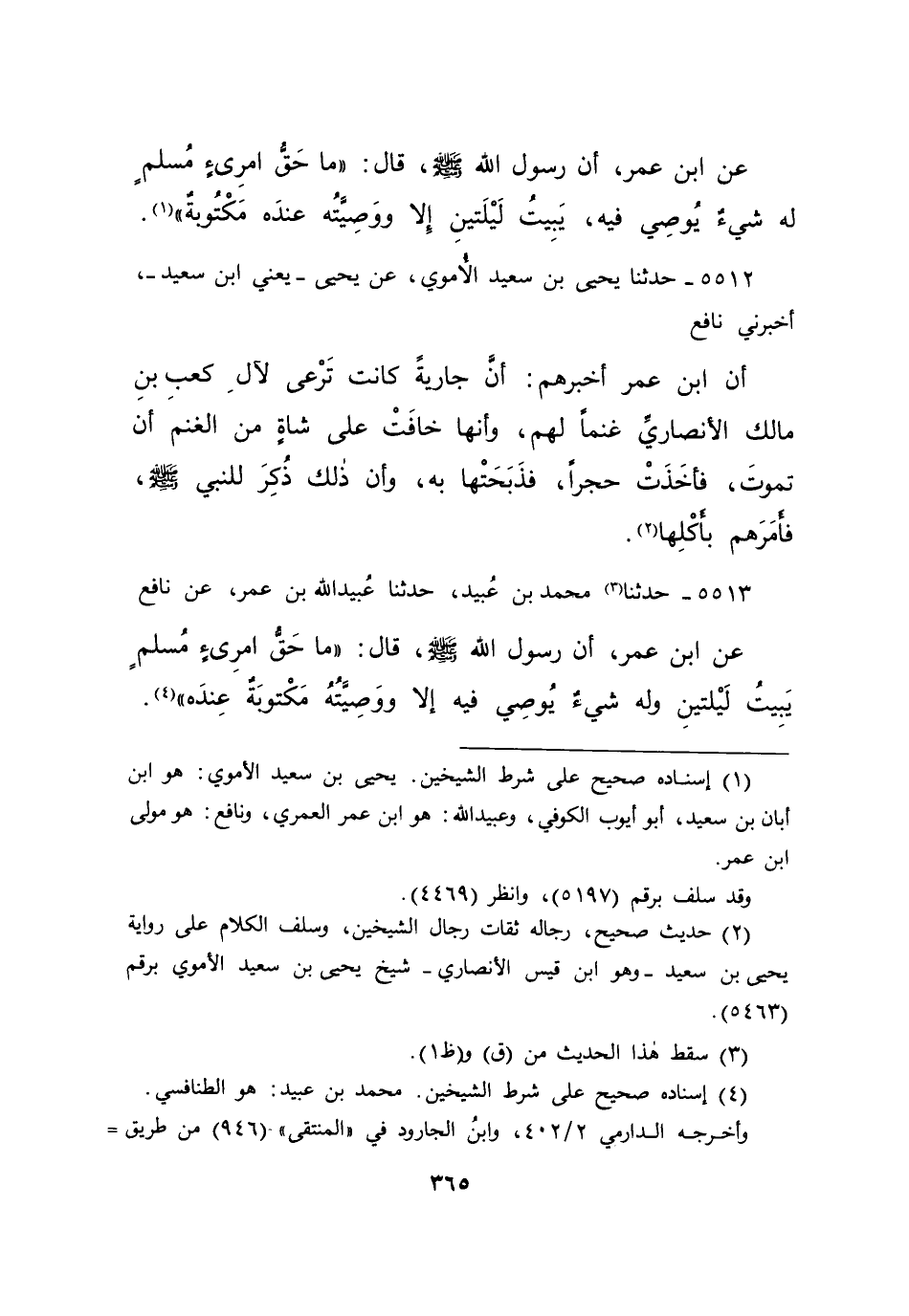 عَنِ ابْنِ عُمَرَ، أَنَّ رَسُولَ اللهِ صَلَّى اللهُ عَلَيْهِ وَسَلَّمَ قَالَ: " مَا حَقُّ امْرِئٍ مُسْلِمٍ لَهُ شَيْءٌ يُوصِي فِيهِ يَبِيتُ لَيْلَتَيْنِ إِلَّا وَوَصِيَّتُهُ عِنْدَهُ مَكْتُوبَةٌ " (١)