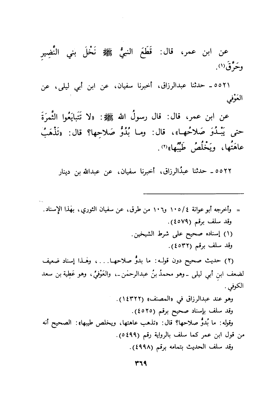 ٥٥٢١ - حَدَّثَنَا عَبْدُ الرَّزَّاقِ، أَخْبَرَنَا سُفْيَانُ، عَنِ ابْنِ أَبِي لَيْلَى، عَنِ الْعَوْفِيِّ، عَنِ ابْنِ عُمَرَ قَالَ: قَالَ رَسُولُ اللهِ صَلَّى اللهُ عَلَيْهِ وَسَلَّمَ: " لَا تَتَبَايَعُوا الثَّمَرَةَ حَتَّى يَبْدُوَ صَلَاحُهَا "، قَالَ: وَمَا بُدُوُّ صَلَاحِهَا؟ قَالَ: " تَذْهَبُ عَاهَتُهَا وَيَخْلُصُ طَيِّبُهَا " (٢)