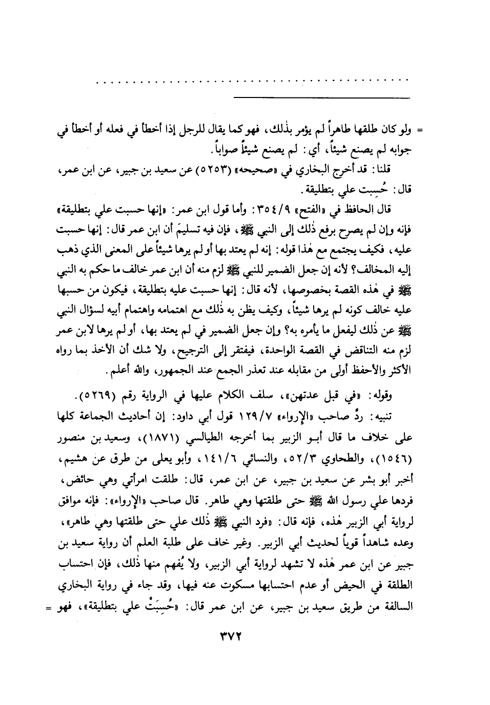 تنبيه: رد صاحب"الإرواء"٧/١٢٩ قول أبي داود: إن أحاديث الجماعة كلها على خلاف ما قال أبو الزبير بما أخرجه الطيالسي (١٨٧١) ، وسعيد بن منصور (١٥٤٦) ، والطحاوي ٣/٥٢، والنسائي ٦/١٤١، وأبو يعلى من طرق عن هشيم، أخبر أبو بشر عن سعيد بن جبير، عن ابن عمر، قال: طلقت امرأتي وهي حائض، فردها علي رسول الله صَلَّى اللهُ عَلَيْهِ وَسَلَّمَ حتى طلقتها وهي طاهر. قال صاحب"الإرواء": فإنه موافق لرواية أبي الزبير هذه، فإنه قال:"فرد النبي صَلَّى اللهُ عَلَيْهِ وَسَلَّمَ ذلك علي حتى طلقتها وهي طاهر"، وعده شاهداً قوياً لحديث أبي الزبير. وغير خاف على طلبة العلم أن رواية سعيد بن جبير عن ابن عمر هذه لا تشهد لرواية أبي الزبير، ولا يُفهم منها ذلك، فإن احتساب الطلقة في الحيض أو عدم احتسابها مسكوت عنه فيها، وقد جاء في رواية البخاري السالفة من طريق سعيد بن جبير، عن ابن عمر قال:"حُسِبَتْ علي بتطليقة"، فهو=