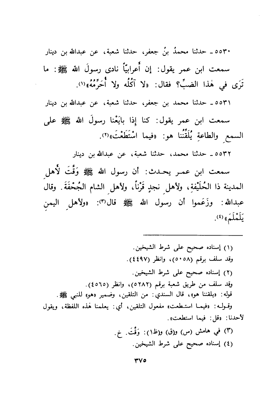٥٥٣١ - حَدَّثَنَا مُحَمَّدُ بْنُ جَعْفَرٍ، حَدَّثَنَا شُعْبَةُ، عَنْ عَبْدِ اللهِ بْنِ دِينَارٍ، سَمِعْتُ ابْنَ عُمَرَ يَقُولُ: كُنَّا إِذَا بَايَعْنَا رَسُولَ اللهِ صَلَّى اللهُ عَلَيْهِ وَسَلَّمَ عَلَى السَّمْعِ وَالطَّاعَةِ يُلَقِّنُنَا هُوَ " فِيمَا اسْتَطَعْتَ " (٢)